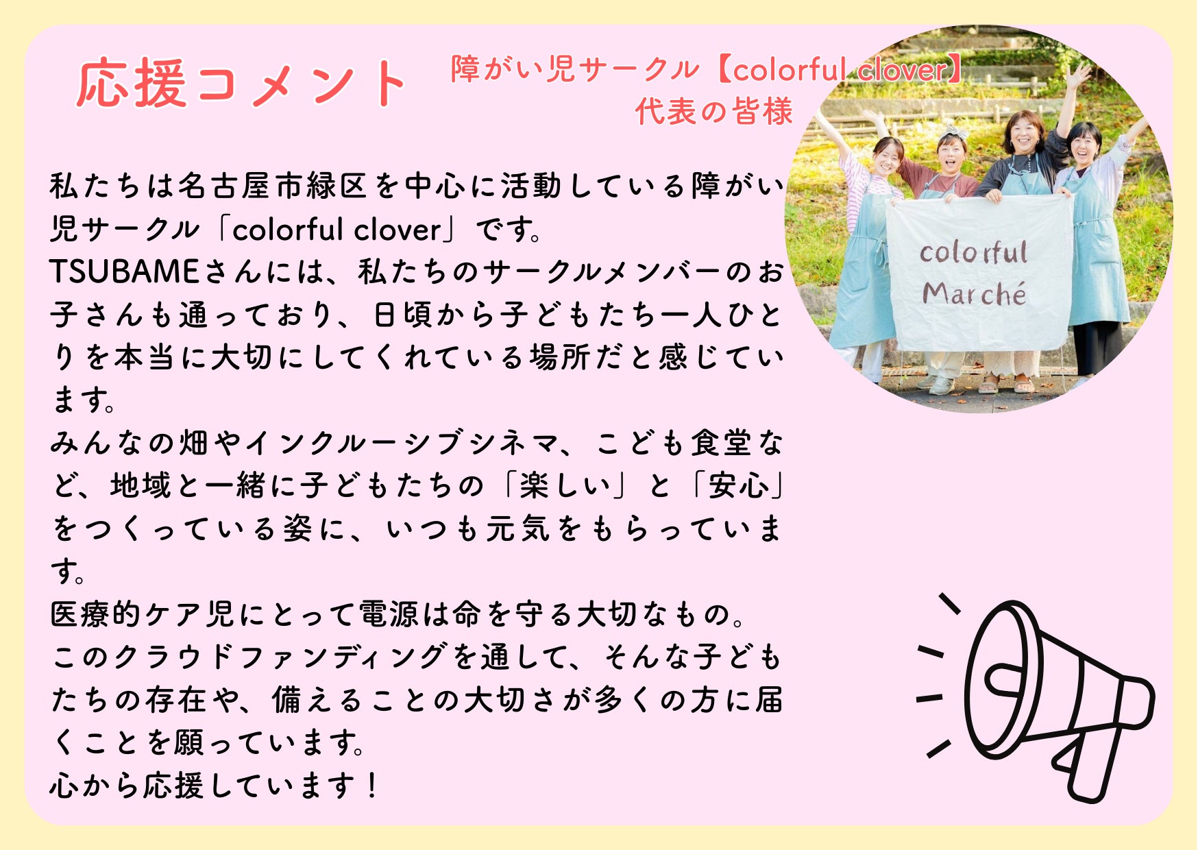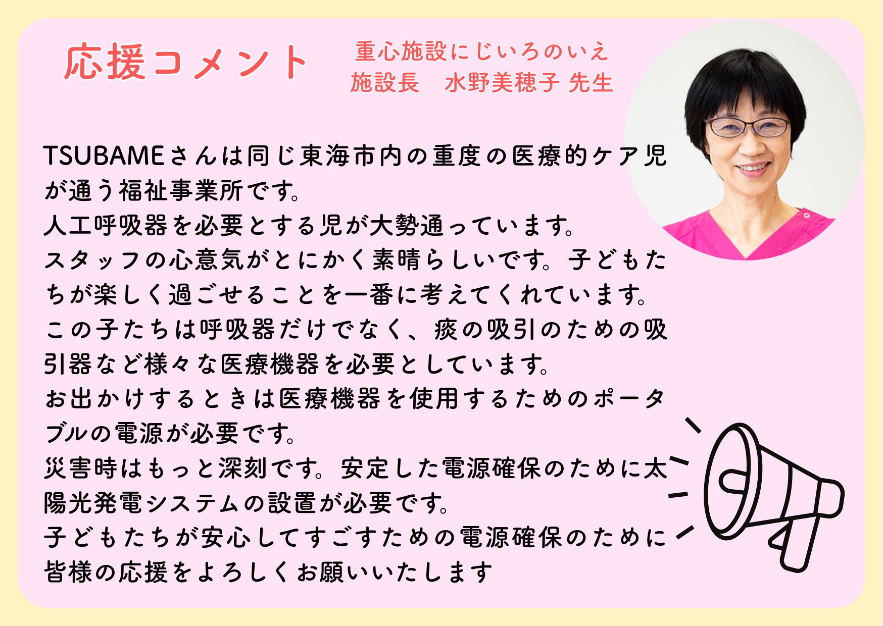 今回このプロジェクトを立ち上げるにあたり、目の前にいる利用児者様を前に、今被災したら…と考えた時、私は胸がいっぱいになりました。どうしたらともに助かることができるだろうか。どこに避難できるのだろうか。もし今ここで停電したら、助けたいのに、助かったのに、どうすることもできない現状をただ見守ることしかできないのかと…。やはり医療的ケアのある方々とともに生きるために、電力の確保は絶対に必要なことなのです。私たちのこのプロジェクトが、この現状を一人でも多くの方に知っていただき考えるきっかけとなり、より多くの方の心に届くことを心から願っています。