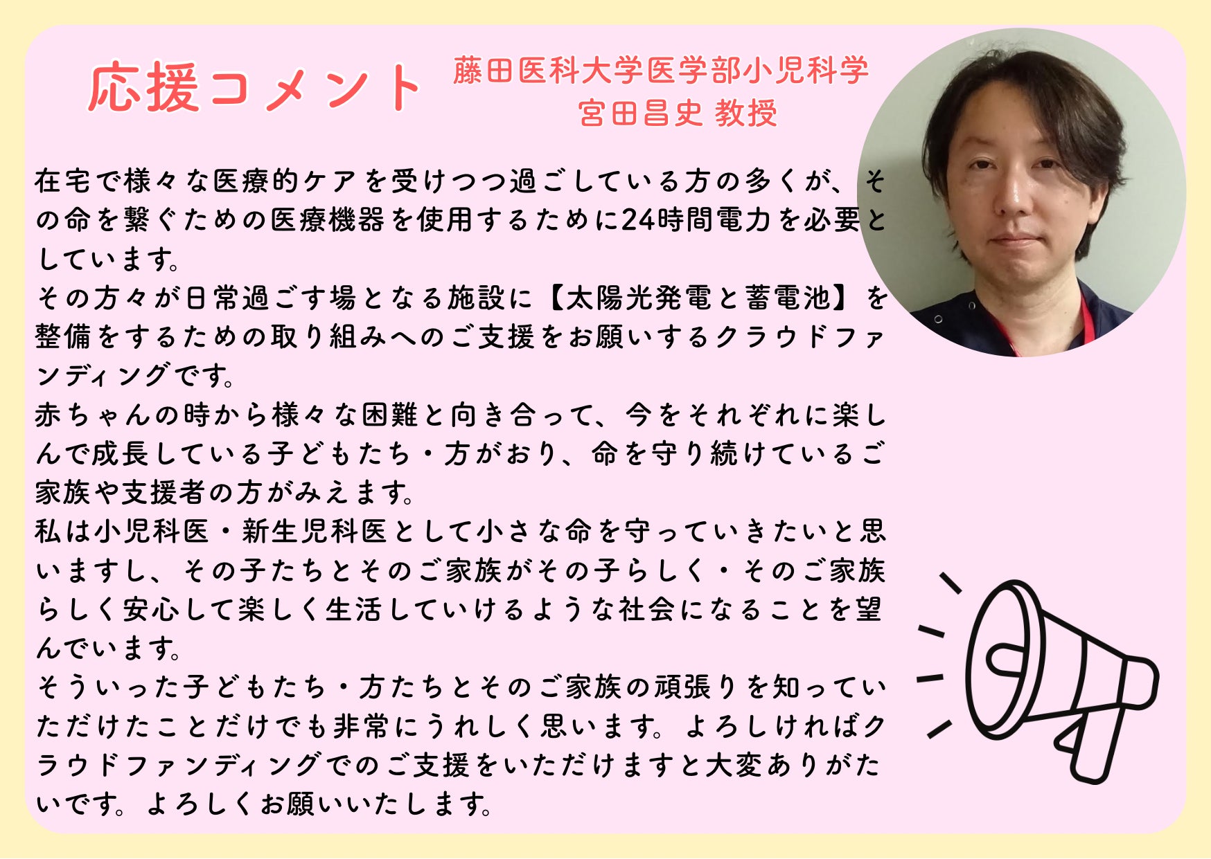 そして、一人でも多くの方にこのプロジェクトが届くことで、医療的ケアが必要な方にとって災害時の電源の確保がいかに重要なことかを知っていただくことができると考えています。『医療的ケアが必要な方にとって継続的な電源は、災害時だけでなく日常生活においても絶対に必要なこと』ということを、【自分の大切な人だったら】と考え、未来への1歩として力を貸していただきたいのです。