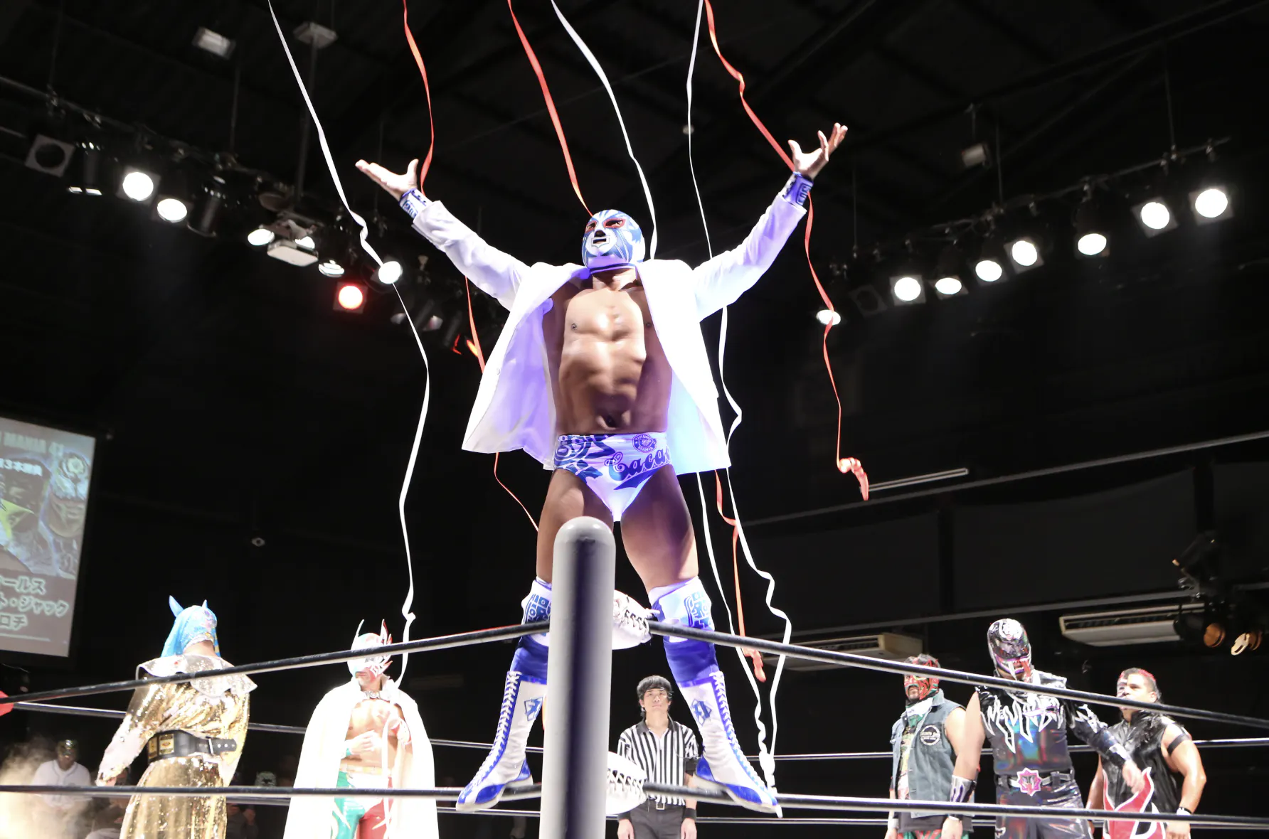 2025/11/06 13:59<セミファイナル>60分3本勝負(赤)TSUBASA、ミステル・カカオ、大和ヒロシ、勝村周一朗 vs.(青)守部宣孝、ビオレント・ジャック、ドラゴン・ユウキ、CHANGO もっと見る対戦カード<第三試合>