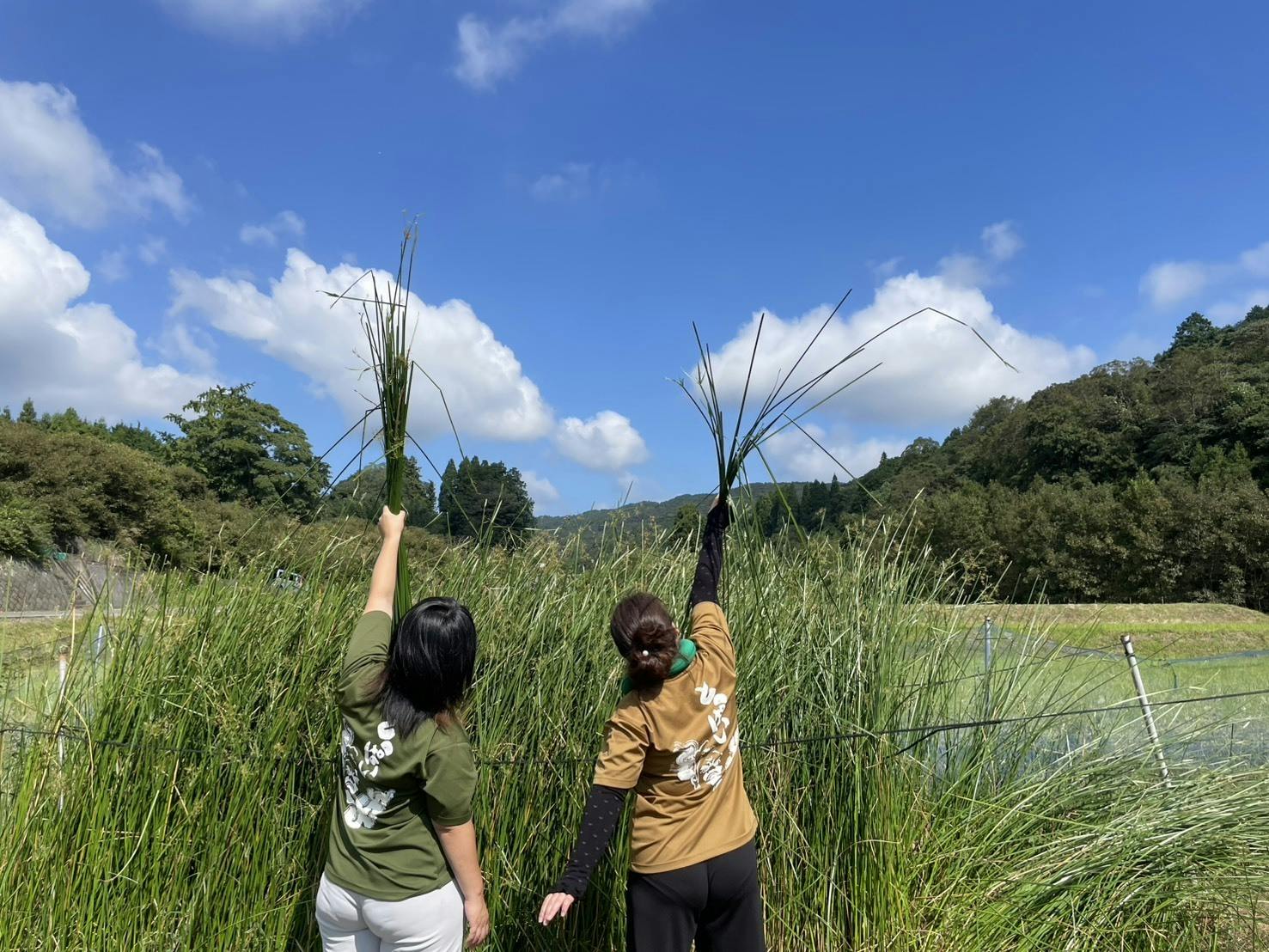 ジンの材料“七島イ”刈り(左:社長、右:専務)