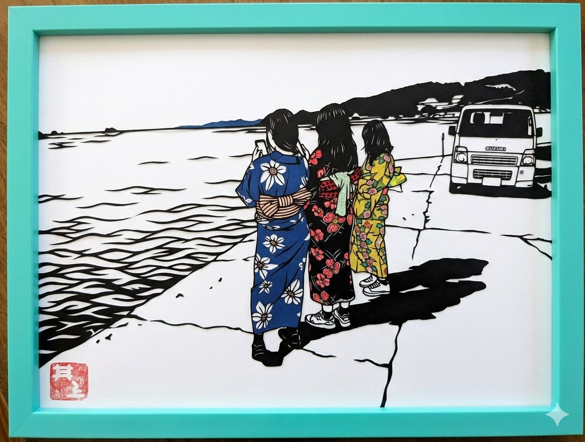 昨日、友達がGeminiアプリで、去年埼玉からリフォーム中の古民家に修学旅行に来てくれた女子高校生の蔵貫海岸での浴衣姿の写真を切り絵風にしてみてくれました。もともと可愛い写真だったんですが、さらに可愛くなっています!本当の切り絵が欲しくなりますね!(良く見てたら三人とも靴に入っていました:-))