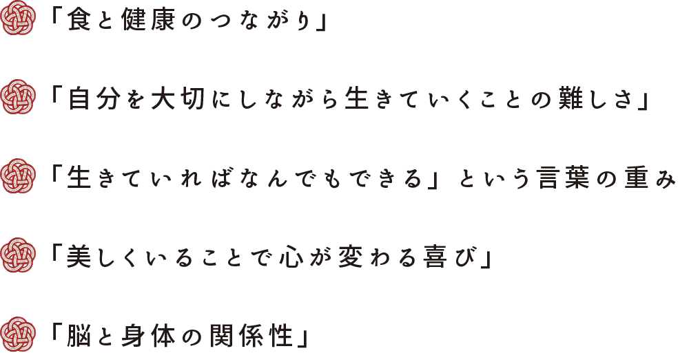 そして何より、「生・健・食・美」に共感し、私の想いに耳を傾けてくださるお客様の存在があったからこそだと思います。