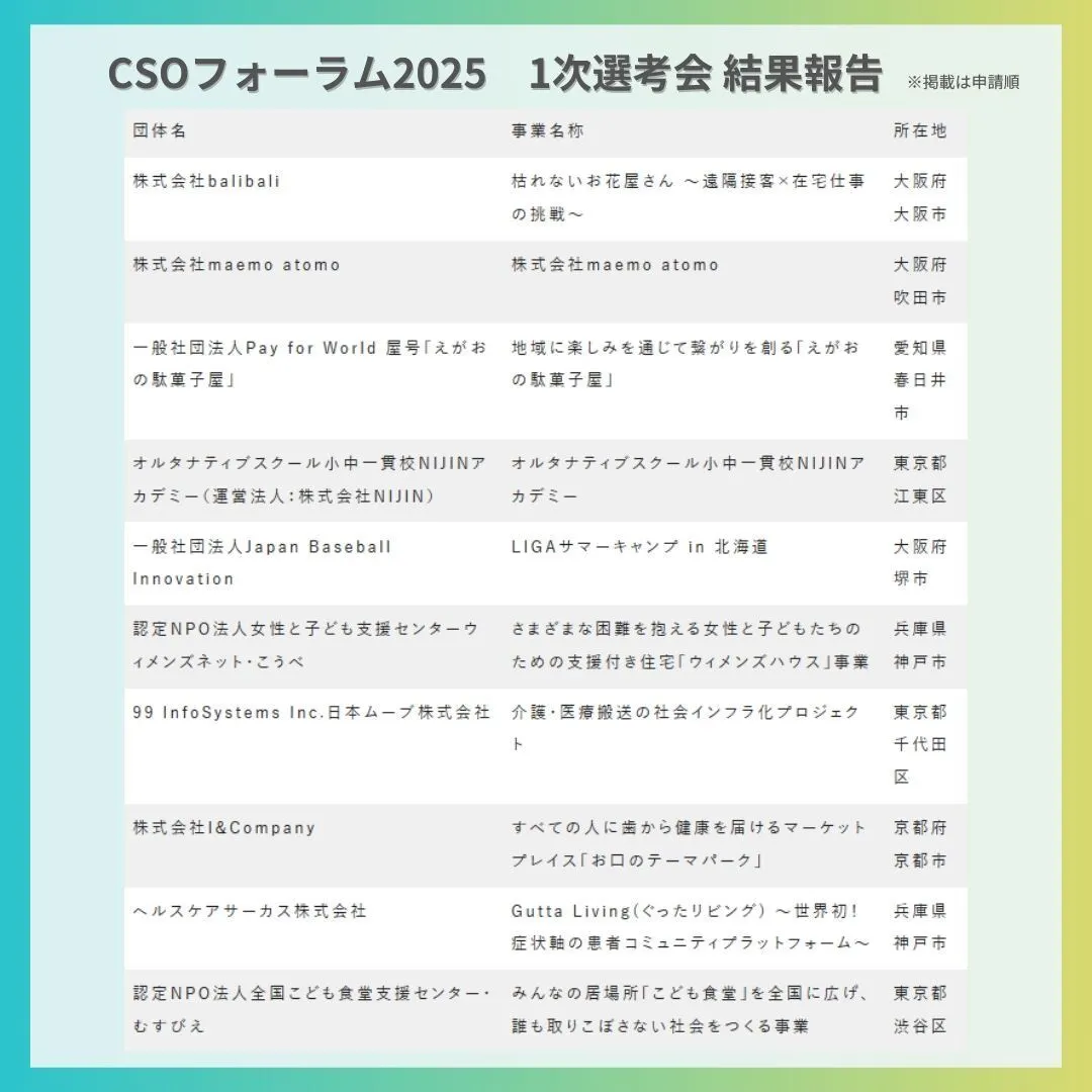 そして、1次選考会(書類審査)において2次選考会に進む10団体を決定しました!