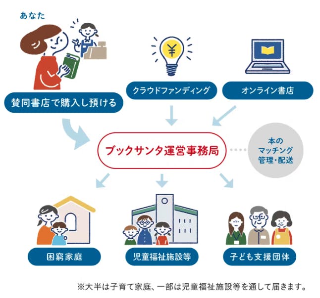 ブックサンタは、チャリティーサンタが主催し、書店業界と連携することで「大変な境遇にいる全国の子ども達へ、”新品の本”を届けたい」という想いから生まれたプロジェクトです。