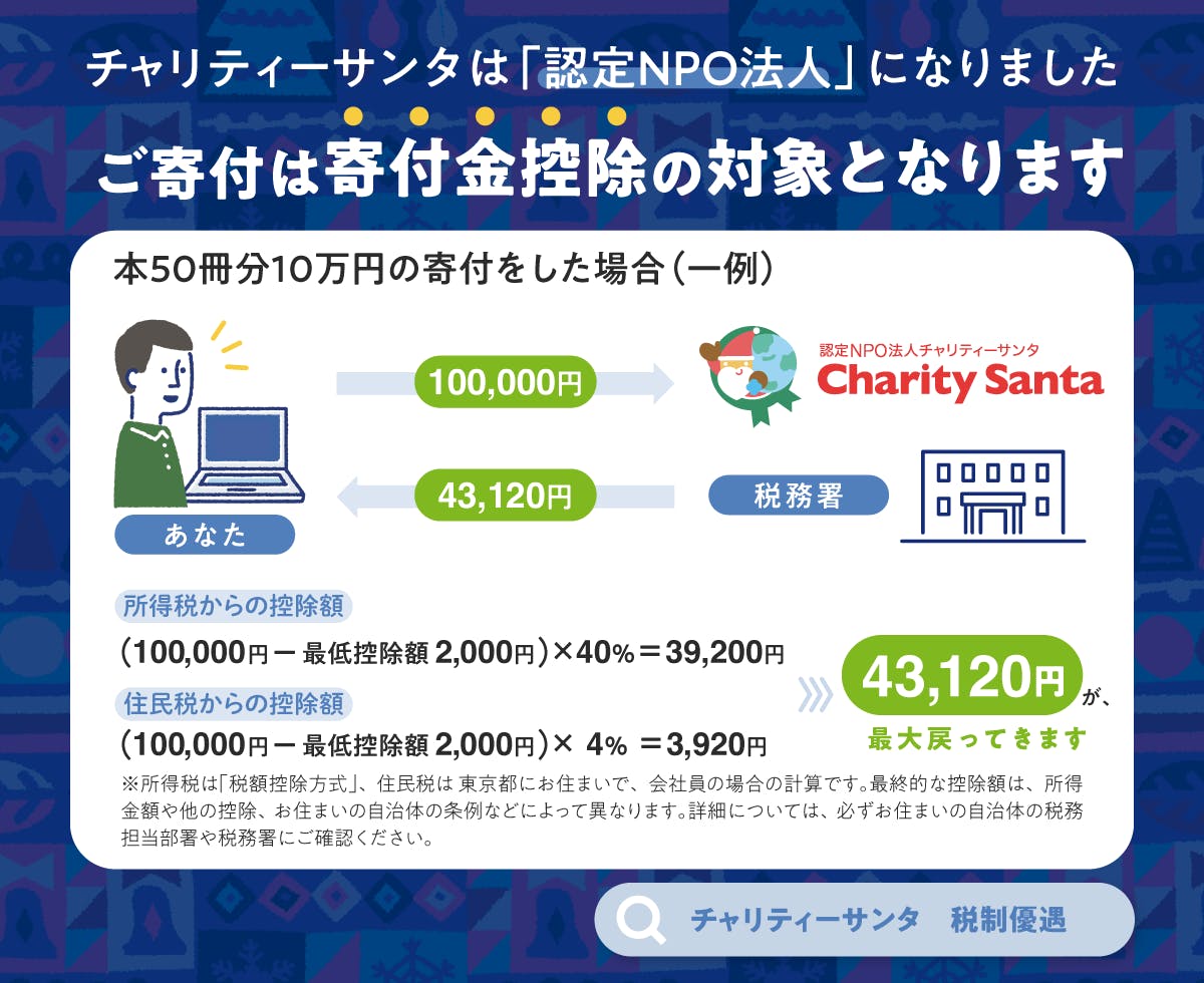 ブックサンタを含め、チャリティーサンタへの寄付は、寄付金控除が受けられるようになりました。本ページからの支援でも、団体公式サイトからの寄付もどちらも対象です。
