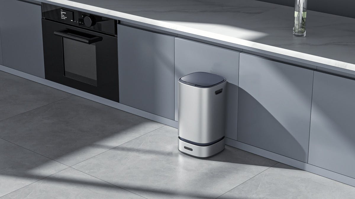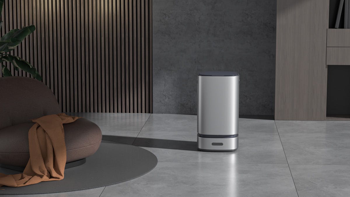 ステンレス製の本体は、寝室・リビング・キッチンなど好きな部屋に置いてしっくりなじむデザイン。容量は13リットルで、机の下や家具のすき間に設置しやすいサイズ感です。