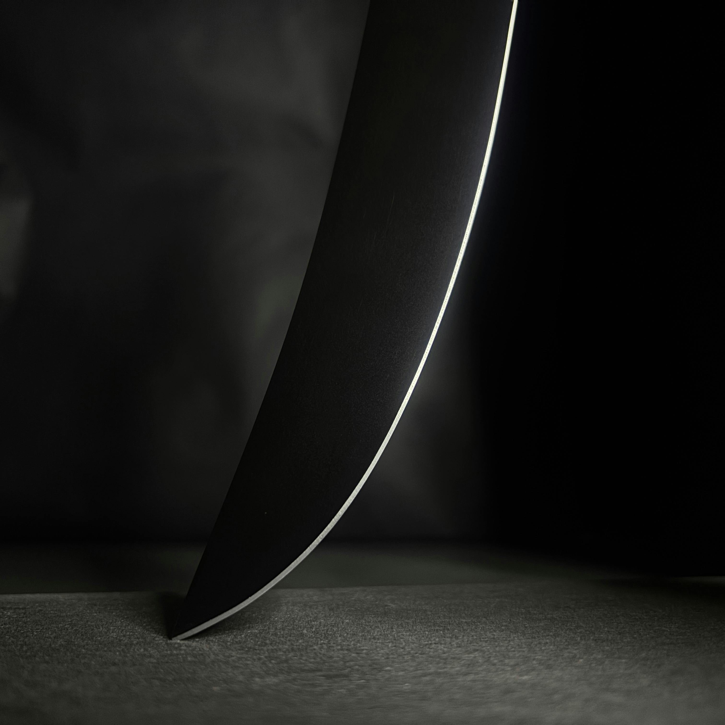 日本刀のように美しく反りを入れたシルエット。ブラックオキシデーションという特別な酸化加工による、深みのあるマットな黒の質感。
