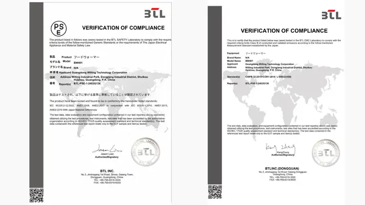 MUHLE・マルチフードウォーマーは、日本の電気用品安全法(PSE)に適合した製品です。信頼性の高い第三者機関(BTL INC.)にて、以下の2つの安全試験を実施・合格しています。
