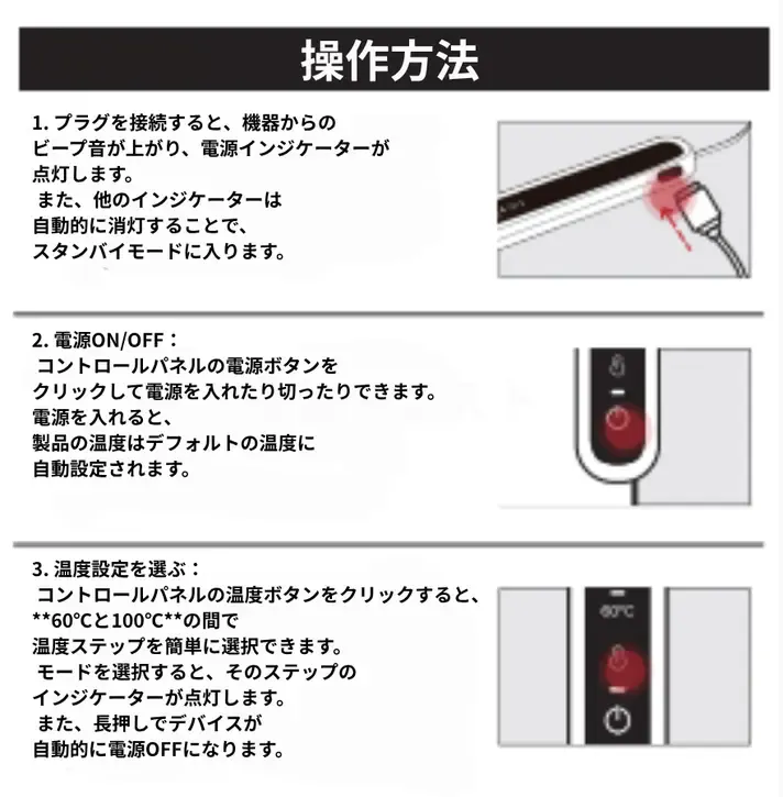 コントロールパネルの電源ボタンを1回押すと加熱が始まります。初期設定では60℃に自動で設定されます。