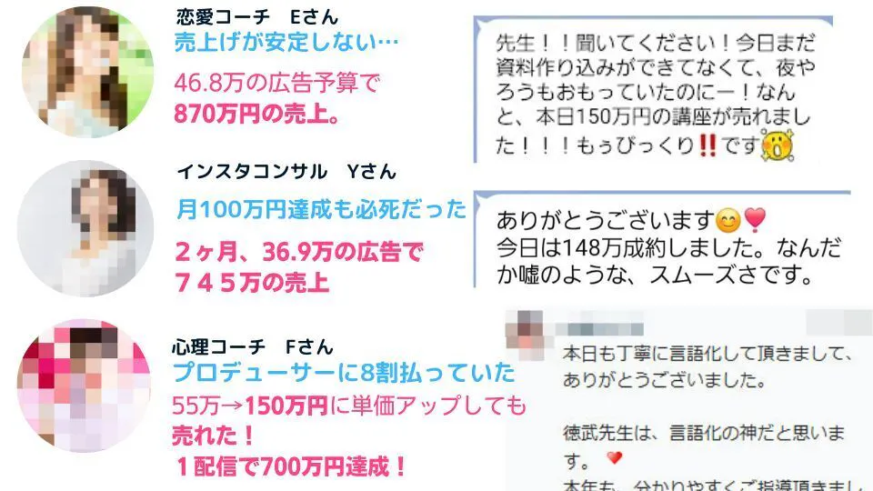15万の広告費で1830万の売上を出すなど、個人起業家の売上アップを支援しています。