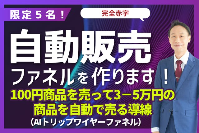 今回の書籍で紹介している無料オファーから100円商品を販売し、3-5万のバックエンド商品を売る流れ(AIトリップワイヤーファネル)を徳武輝彦がチーム一丸となって完全代行します!