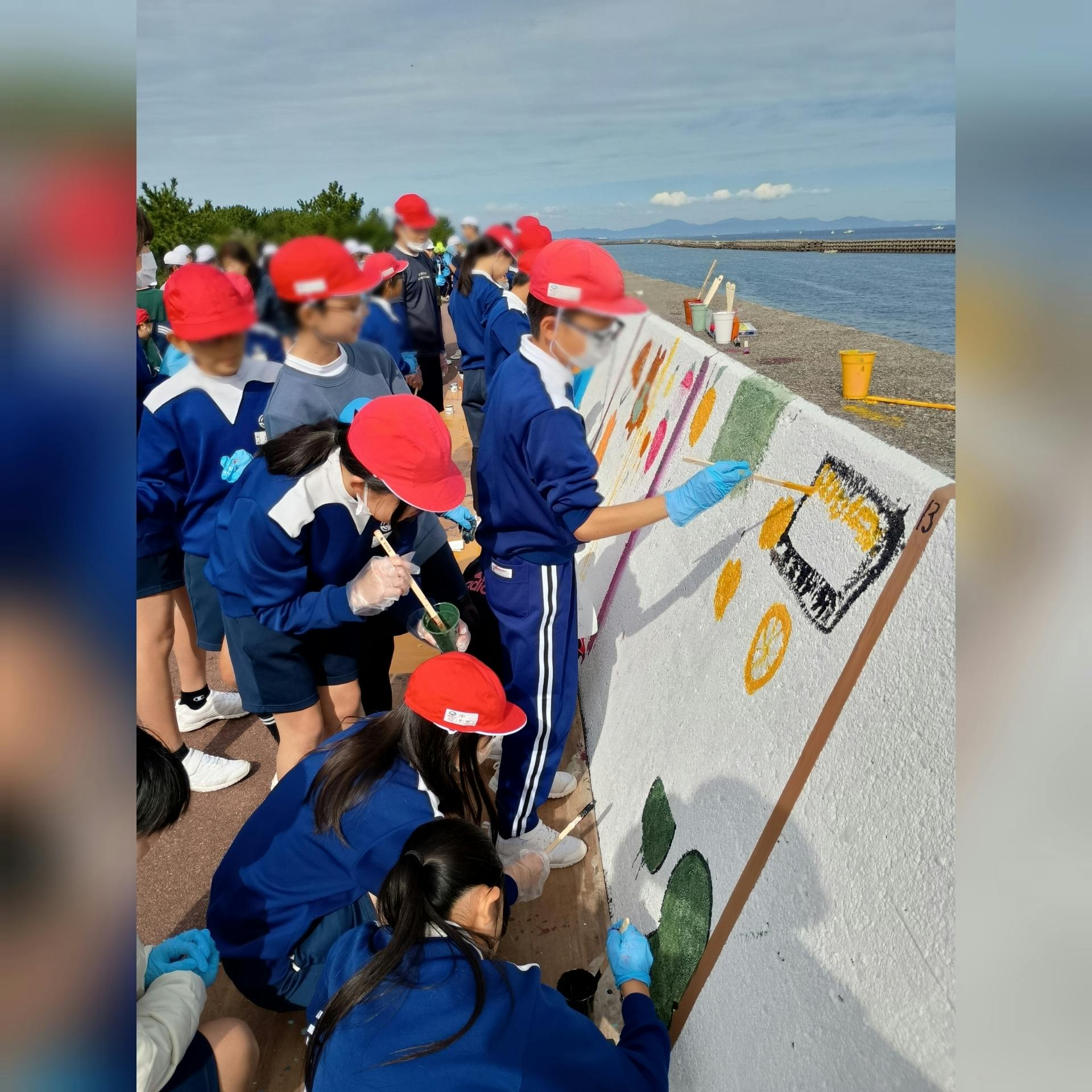 4日、平島子どもセンター・今津子どもセンター・なかがわ保育園・平島小学校・今津小学校・新野東小学校の子どもたちが、9日の「壁画再創造」を前に絵を描きに来てくれました!