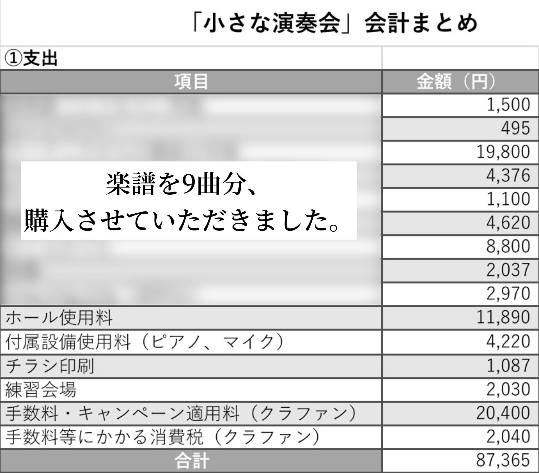 支援金が振り込まれるまでの期間に立て替えを行って楽譜などを購入してきました。下に載せている表は、現時点(R08/01/30)においての支出額です。