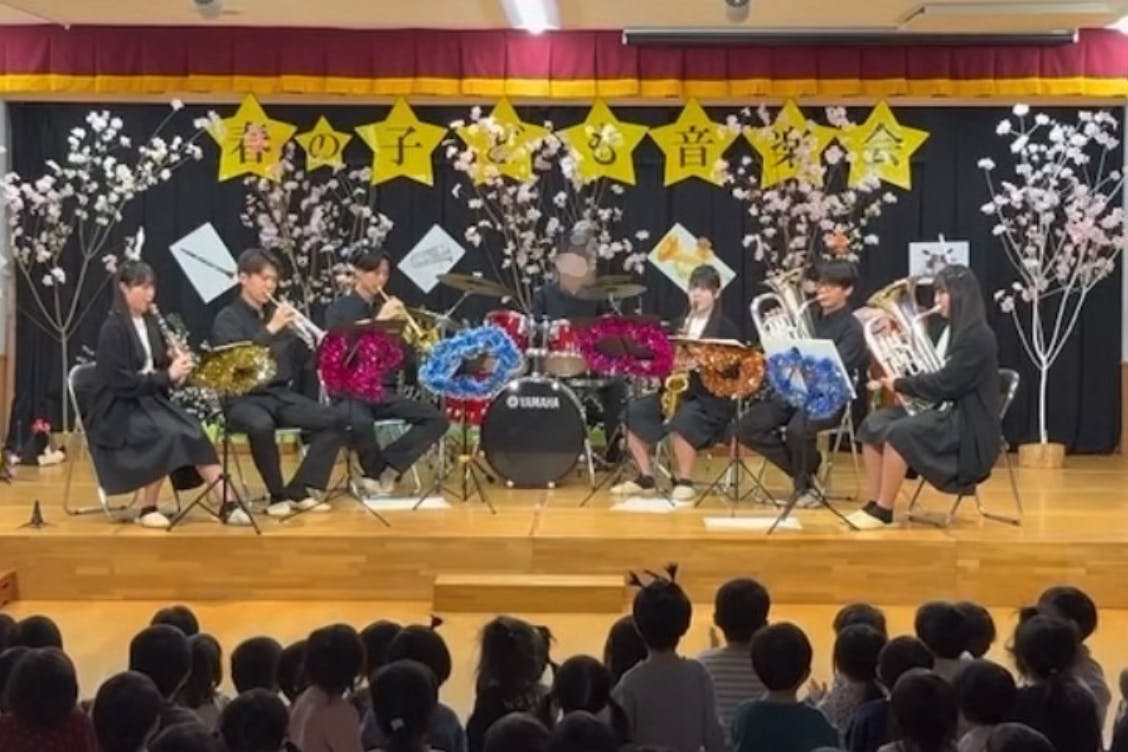 シーソーブラスアンサンブルは、商業施設や児童館、福祉センターなど、さまざまな場所で演奏し、中国新聞に載せていただいたことをきっかけに、保育園での演奏のご依頼を受けました。その時男子3人では心細いということから、同級生の女子を3人呼んで演奏会を行ったたのが今回のメンバーが集まるきっかけであり、今までの活動です!演奏会の度に、多くの方に感謝のお言葉をいただき、私たちのやりがいになっています。