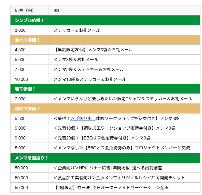 2025/11/30 07:06おはようございます!本日11/30クラウドファンディング最終日となりました!ご支援くださった57人の皆さまに心から感謝いたします。ありがとうございます。支援するつもりだったけどするタイミングを見計らっていた人は今ですよ(`・ω・´)笑さて①販売したメンマの数②今後の製造体制についてご報告いたします。①販売したメンマの数10月18日より本日までの42日間でお届けしたメンマの数を発表します。426袋!!!!!!!1人で何袋も購入いただいた方もいらっしゃいましたが、「お友だちに配るね!人にあげる!」とお買い求めいただいた方も多く、1日で約10人にお届けできた計算になります・・!そして、クラウドファンディングでご支援くださった方々にお届け予定のもの、12月中のイベントでの販売も考えると800近くになる想定です。楽しく美味しく面白く・・・とメンマ作りをはじめた私たちとしてはまずまずのスタートが切れたのではないかと思います!ご支援者の皆さま、メンマのお届けまで今しばらくお待ちください!見積依頼をくださった皆さま、もう少しお待ちください!Facebook、Instagramをフォローしていただき、今後の活動も温かく見守っていただけると幸いです。②今後の製造体制たくさんの方にお届けしようと思うと、まずは安定的な生産体制をつくることが必要。今後は金沢国際ホテル敷地内の加工所を備えた建物にてメンマの製造を行う予定で少しずつ話を進めております。11/29にはカットの工程でお試し利用をさせていただきましたが、これからが更に楽しみになりました・・・!設備が整ったらぜひぜひ皆さま、遊びに来てください^^ーーーーーーーーーーーーーーーーーーーーーーーーーp.s. メンマを作りたいと言った人より安定的な生産ができる体制、販売場所も持たず、受注生産のような形でのスタートとなりました。今年は塩漬けメンマをすべて素材として富山に買取いただいて、2年目に向けて商品開発をしていこう・・・という話でしたが、諸事情によりちょっと難しくなってしまいました。材料ならいっぱいあるし・・・・だったら「商品開発をスタートしちゃえ!!!ついでに販売もしちゃえ!!!ちゃんと商品ができたときにファンがたくさんいる商品にしちゃえ!!!」と勢いのまま本日を迎えています。・ティー・ツリー・コミュニケーションズの皆さま・NPO法人みんなの畑の会の皆さま彼らや彼らを支える皆さまの多大なるご協力もあり、「金沢メンマが誕生した」ということをたくさんの方にまずは知っていただくことができた、そんな1シーズンでしたが、2シーズン目は、より金沢メンマと呼ぶにふさわしい商品に仕上げていけたらいいなと思います。そして「メンマを作りたい!」というたった一言から、本当に1年でここまでになるとは思ってませんでしたし、生産体制づくりもこんなにトントン進めていけるものとは思っていませんでした。精緻な計画も持たず、その時の流れに身を任せてきましたのに、このように進めてこれたのは、忙しいなか、自発的に、共にチャレンジしてくれた7人のおかげ。ゆうすけ、久野さん、じゅんなさん、ようすけさん、じゅんさん、まみさん、まこっちゃん・・・ありがとうございました!そして、これからもよろしくお願いいたします・・✾今後も、主に食やソーシャルの分野で、大小問わず・誰かの挑戦を後押しする事業・困った!を幸せな美味しいに変えていく事業にたくさんの方と一緒にチャレンジしていきたいと思います。 おわりーーーーーーーーーーーーーーーーーーーーーーーーー もっと見る質問へ回答します!(残り3日だー・・・)