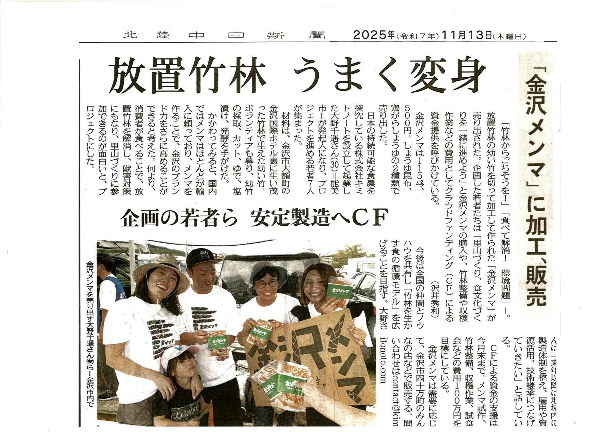 「どうやって8人集まったの?」 こちらの質問にゆっくり回答するシリーズのvol.3でございます。〈前回までのあらすじ〉発起人が地域で活動するNPO法人の代表に共感!↓ゆうすけに声かけて2人目!↓3人目・・・なかなか集まらずこんな感じでしたねワークショップに手伝いに来てくれていた久野さん(自宅の前が竹林)、ワークショップに参加者として遊びに来てくれていたじゅんなさん・ようすけさん切り出し作業が順調にいくかと思いきや、対象の山は竹も裏年で全然生えていなければ、探す範囲を広げるための人もおらず何もかもが不足しているなかでどうやろうと思ったかというと「竹林ある人持ってきてーーー!買取しますーーー!!」作戦でした。そんな声をどこからともなく聞きつけた、まみさん、じゅんさんはなんと幼竹を持ってきてくれた後、カットから塩漬けまでのお手伝いまでしてくださるじゃありませんか^^そんなこんなで7人がひとまず出会うところまでのストーリーがありました。塩漬け作業がすべて一区切りしたとところで、「えっとー・・・190kgの竹どうしよう?」本当は富山の会社に今年は買い取っていただく予定でしたが、いろいろな環境や条件が変わり、なるべく自分たちで販売をしないといけないような状況に。そこからは計画がまっさらなところから改めて作戦を立て、知恵を絞り出し、情報を集めなければならなかったので、WSに来てくださった方々や関わりのあった方にいろいろと聞いて回り、「商品作りに興味のある人この指とーまれ!」で集まってくれた、ここまでで登場した7名でのプロジェクトがスタートするはこびとなりました。(途中でまっこっちゃんが入ってきます)商品になる、販売できる、ここまでの様子を竹林に入って実際作業してくださったプロジェクトメンバー8名以外の方々にも引き続き見ていただいているかと思いますが、本当に皆さまのおかげで商品になりつつあると思います。ありがとうございます・・・!きちんとお返しができるように準備もしておりますので11月末まで(いやその後も)引き続き応援よろしくお願いします♪続く