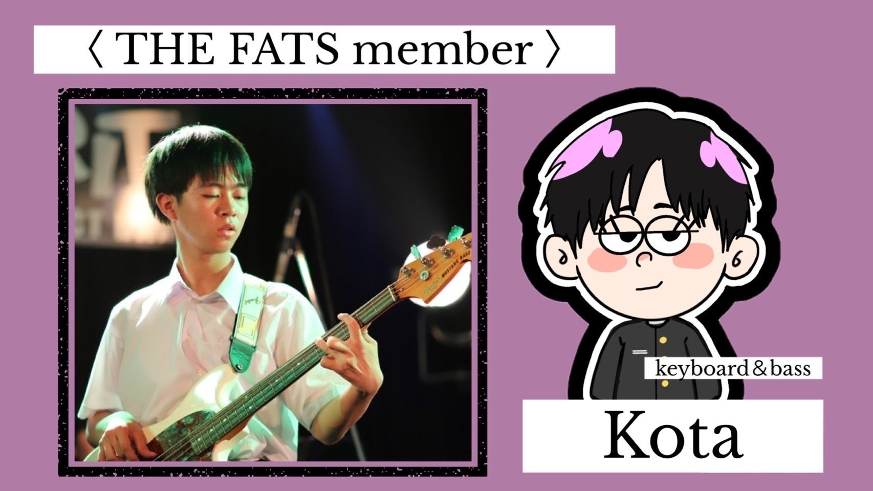 兵庫県で活動している高校生ロックバンド、THE FATS(ザ ファッツ)と申します。メンバー全員の名前に「太」という漢字が入っているため「THE FATS」と命名しました!メンバーは全員高校2年生で、ビートルズとオアシスを中心としたUKロックを演奏しています。楽器にもこだわりを持ち、ジョンレノンが愛用していたエピフォン・カジノや、オアシスのノエル・ギャラガーモデルのギターを使いながら、本格的なロックサウンドをお届けしています。