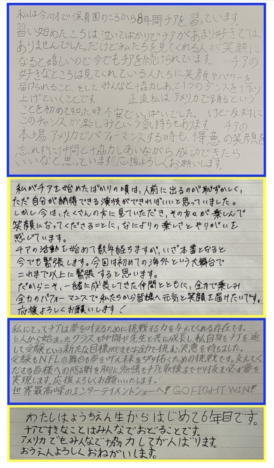 子供達の可能性は無限大です。まだ知らぬ世界への挑戦、夢の大舞台への挑戦を通してその過程で得たものは一生ものの財産となり、『努力は必ず報われる』という事を体現して欲しいと願っています。そして、皆様からの応援のお気持ちが彼女達の人としての成長に繋がると信じています。『思い遣りと感謝』に溢れた人間となり、まわりへ愛ある行動が常にできるように育ってほしいと心より思います。