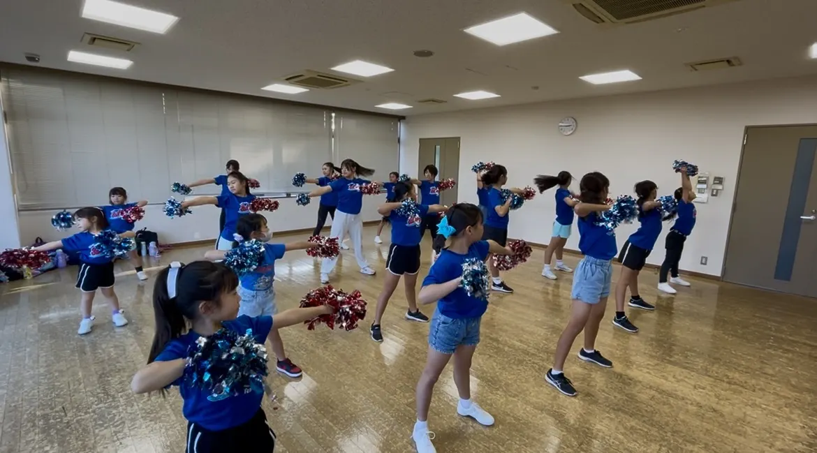 今回は演技の後半部分の振り入れをしました。そして全てのフォーメーション入れを行い、演技途中のポンポン文字も練習しました。ひとまず演技を完成させることができました!