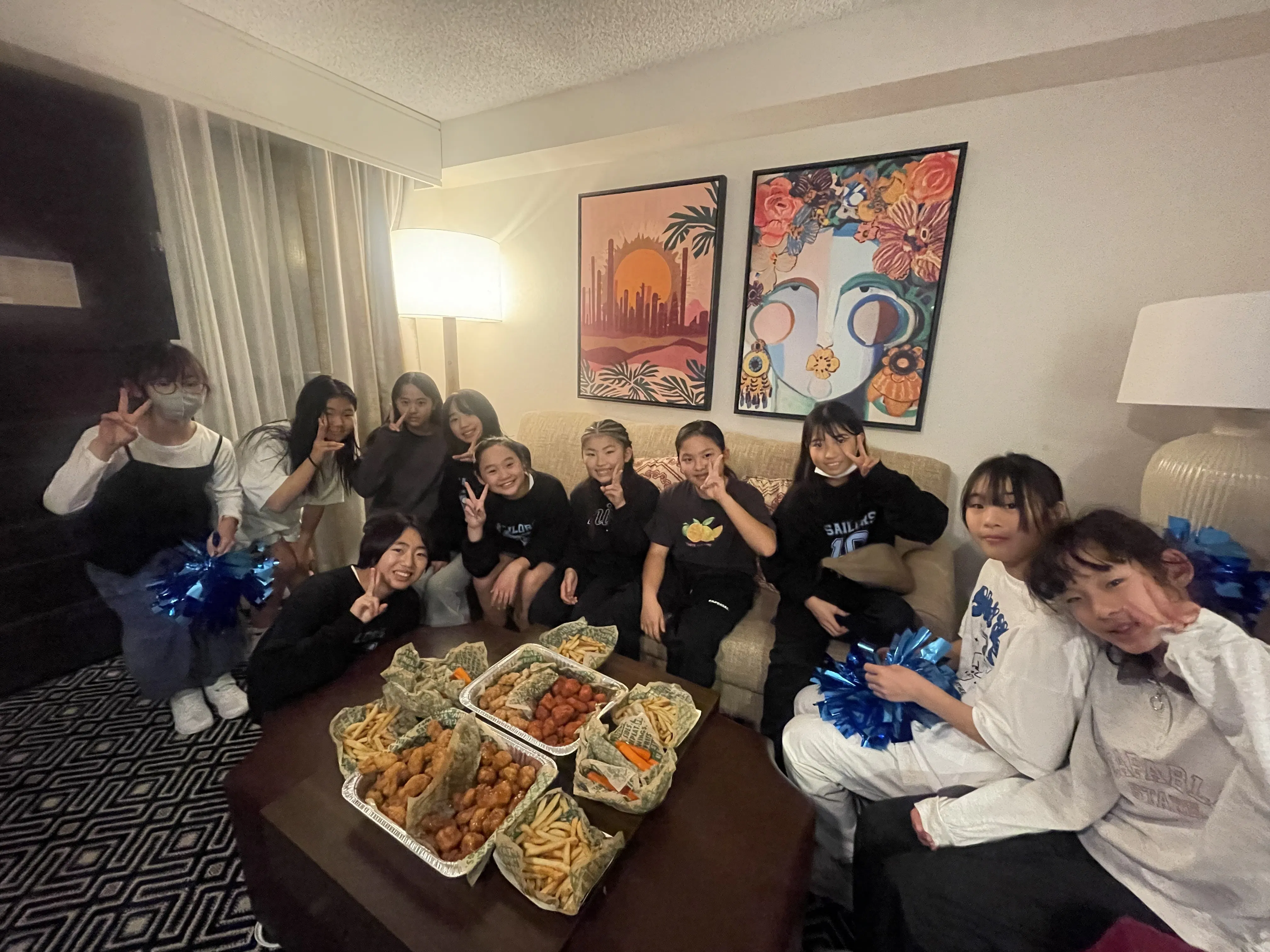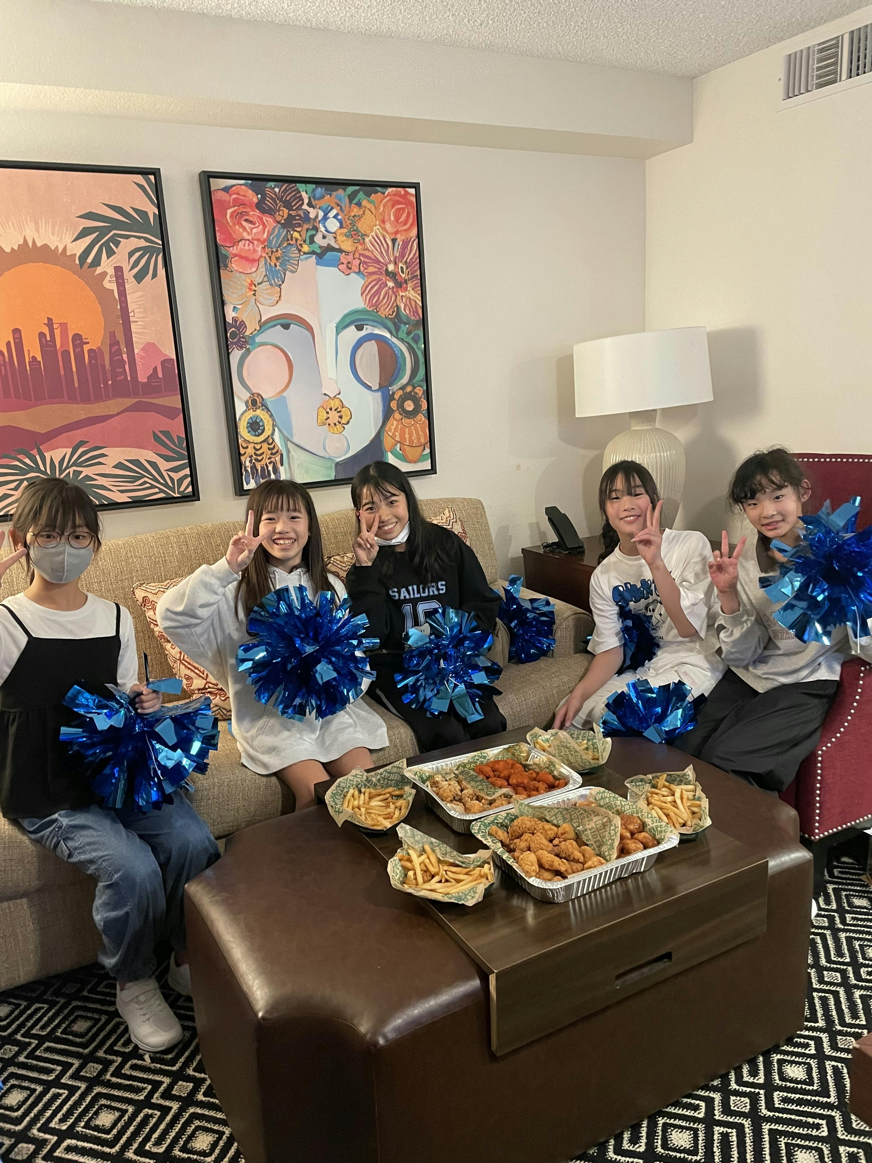 ご支援金は一部、パフォーマンスで使用するポンポンの調達代としても充てさせて頂きました。ホテル到着後は空き時間にみんなで仲良く会話をしながらポンポンを作成したり、ゲームをして楽しみました。