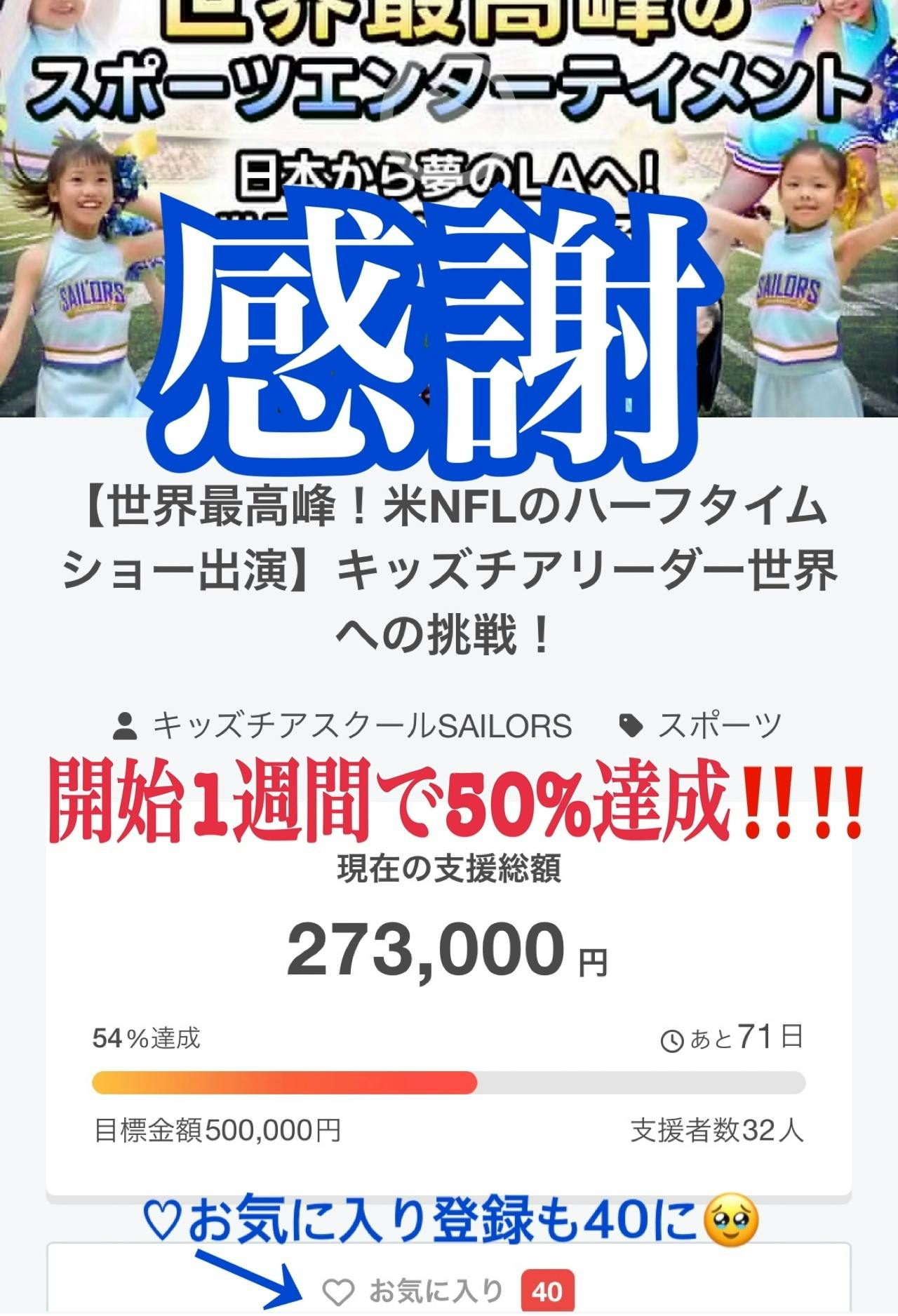 クラウドファンディングを開始して丁度1週間!皆様のお陰で50%達成しました!!!たくさんのご支援誠にありがとうございます。そして日々届く応援のお言葉に本当に励まされている毎日です。お一人お一人のあたたかい、愛ある激励のお言葉で力がわいています。これからも責任を持ってプロジェクトを遂行させて頂きます。そして本日は、横須賀スクールイベント出演をさせて頂きます♪あいにくのお天気ですがイベントは開催予定なので、お越しくださる方はどうかあたたかくしていらしてください。皆様に笑顔とパワーをお届けできるように、雨雲を吹き飛ばす勢いで元気いっぱいにパフォーマンスさせて頂きます☆ワイ!フェスタおっぱま2025(イベント情報)夏島グラウンドにて♪SAILORS15時00分〜出演♪お楽しみ頂けましたら幸いです。キッズチアスクールSAILORS代表講師Ayumi