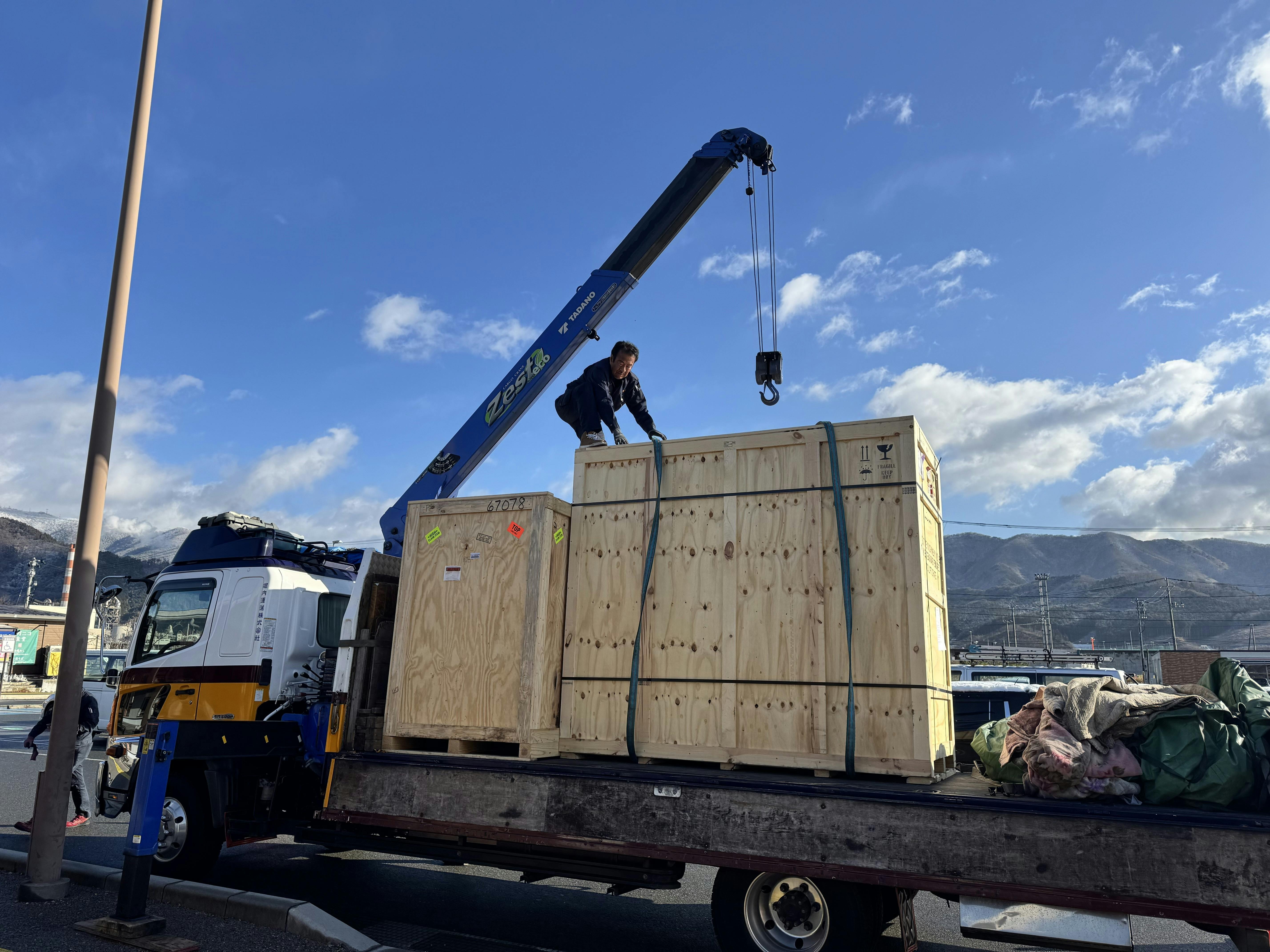 2025/12/05 15:05昨日からチラチラと雪が舞う大船渡。今朝起きたらすっかりと三陸の山々も雪化粧で白くなっていました。空気の透き通った気持ちのいい朝でしたが、朝から気分はソワソワ。今日は醸造設備の第一陣、カンニングマシンが届く日です。カリフォルニアのオークランド港から船積みされて、先週日本に届いたカンニングマシンとラベラー。想像以上の大きさです。横浜税関の手続きに時間がかかり、そこから夜通し走っての早朝に気仙沼に到着したそう。木箱にはSanrikuの文字が。ようこそカリフォルニアから大船渡へ。内装工事の施工会社さんにも手伝ってもらいながら木箱を解体していきます。左がカンニングマシンで右がラベラーです。ここからブルワリー内に4人がかりで運び入れていきます。が、カンニングマシンがデカすぎて持ち上げられません。ハンドリフトでの搬入は難しいと判断。助っ人に来てくれたのはお向かいの魚の駅でバーベキューレストラン「BBQ&BUFFET Happy」を営む和希くん。大力水産のフォークリフトでマシンを運び入れるのを手伝ってくれました。本当に助かりました。水産のまちに改めて感謝。無事に搬入完了です。今回三陸ブルーイングで導入したカンニングマシンはアメリカのWildGoose社のEvolution Seriesです。スペック上では1分間で30缶/、1時間あたり1,800缶、約75ケース分の缶ビールを充填できるシステムです。国内での導入実績が多く、缶ビールの売上比率が高い当社にとって、カンニングのクオリティは生命線であり、品質向上には欠かせない設備と考え、導入を決めました。これから稼働に少しずつ向けて準備を進めていきます。来週はいよいよ醸造設備の搬入です。ブルワリー&タップルームの開業に向けた整備も着々と進行中です。クラウドファンディングはあと24日。引き続き応援をよろしくお願いいたします! もっと見るタップルームの扉が、ついに設置されました!