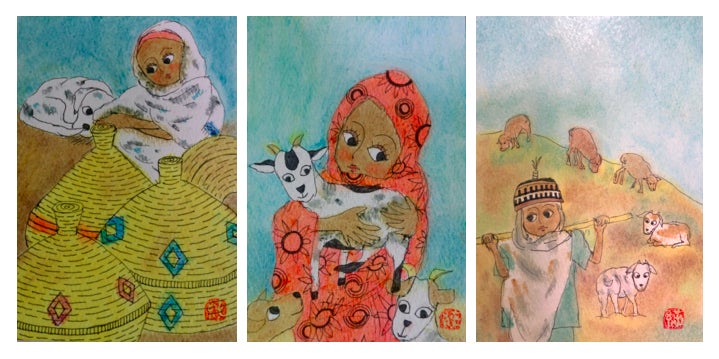 ・エチオピアの日常風景を描いたほのぼのポストカード3点セット