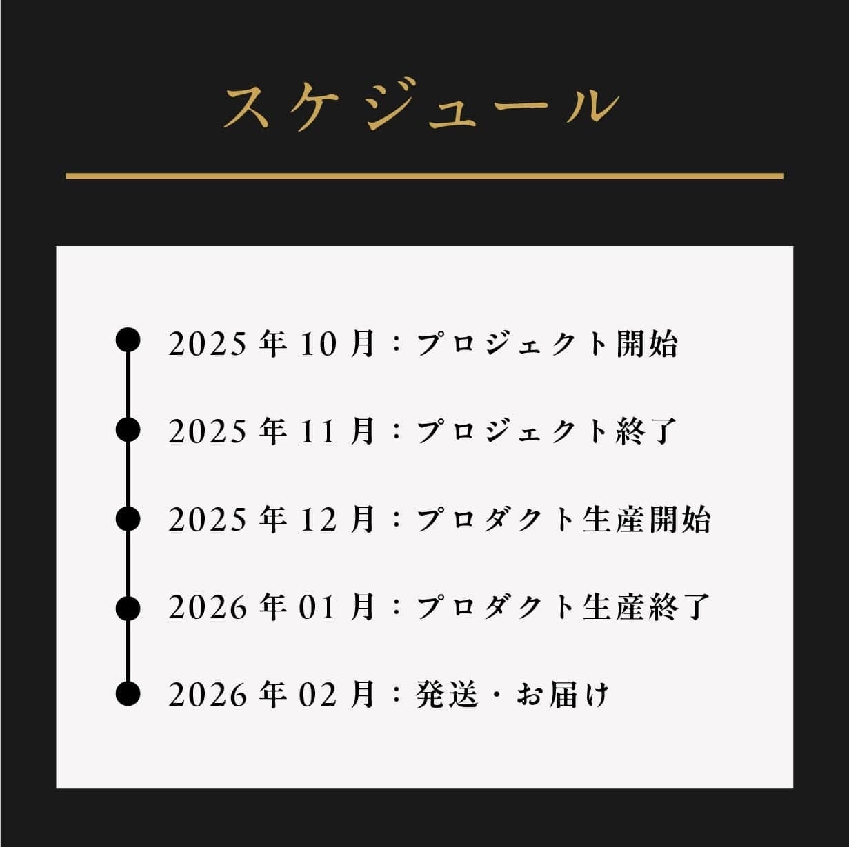 ●引渡し時期: 各リターン詳細に記載の発送予定月を引き渡し時期とします。但し、開発・生産状況によって遅れが生じる場合がありますのでその際は当プロジェクトページ内の「活動報告」または購入者へのメール等で連絡します。