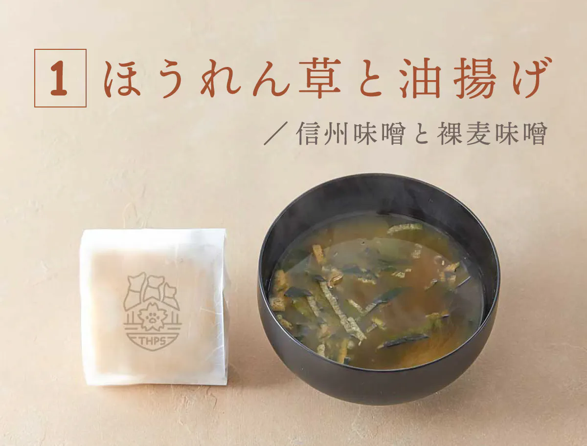 ①ほうれん草と油揚げ(信州味噌と裸麦味噌)