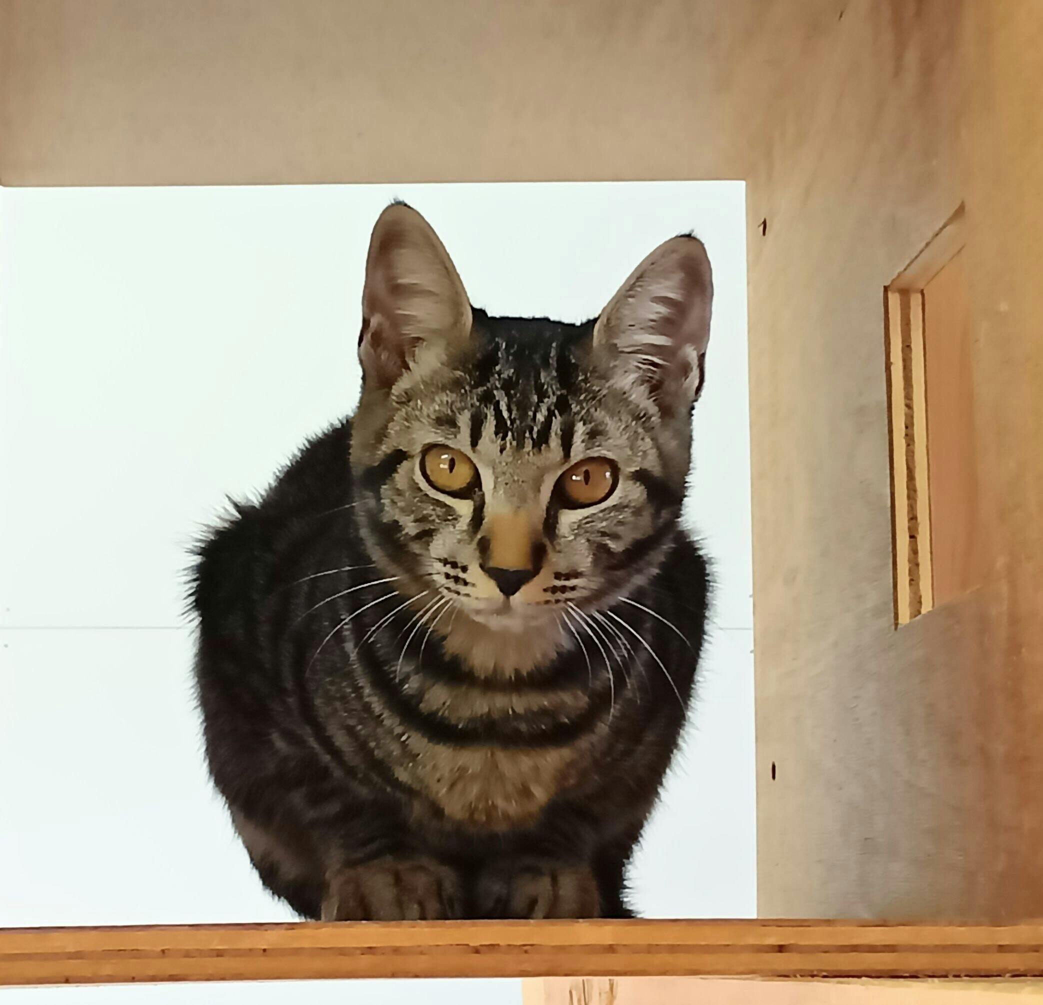 黒っぽいキジトラ柄で、黒いお鼻がチャームポイント。