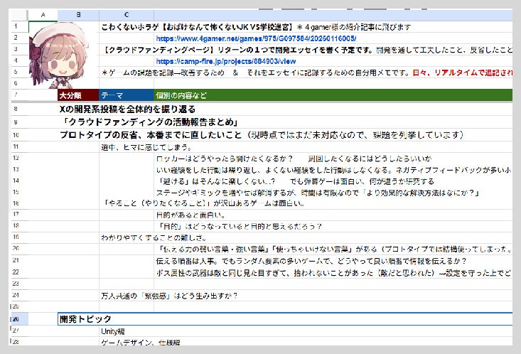 こんにちは、一条りりりです。いつも沢山の応援ありがとうございます。本当に励みになっています。プロトタイプの感想も徐々にいただきはじめています。本当にありがとうございます。本開発に向けて改善が必要な点も色々感じているので改善リスト作りました!https://docs.google.com/spreadsheets/d/1v0JTcOIqQyTOiQ9lIPLrvzdlf5fsl9SGep877E2DeQs/edit?usp=sharing*いただいたご意見などをもとに色々追記していくリストになります。また「反省点と改善したこと」などは開発エッセイにしてまとめる予定ですので、その構成案にもなっています。*■開発記録エッセイコース■のご支援を頂いた方へのリターン自分用のリストではありますが、何を考え、どう進めていくのか、などを日々リアルタイムで追記していく予定です!つたない資料ですが、こうやって進んでいくんだな、面白くなっていくんだな、というその過程の一端をお伝えできれば幸いです。