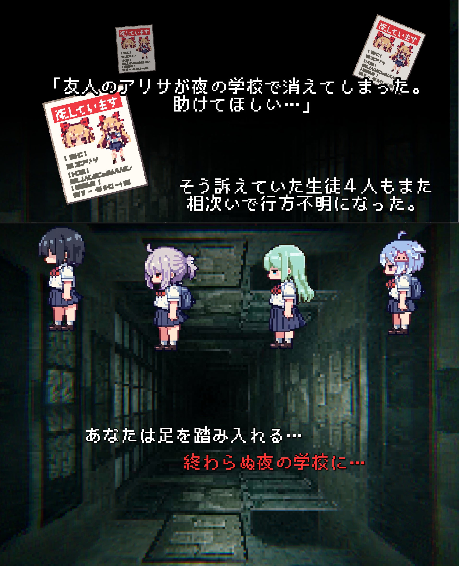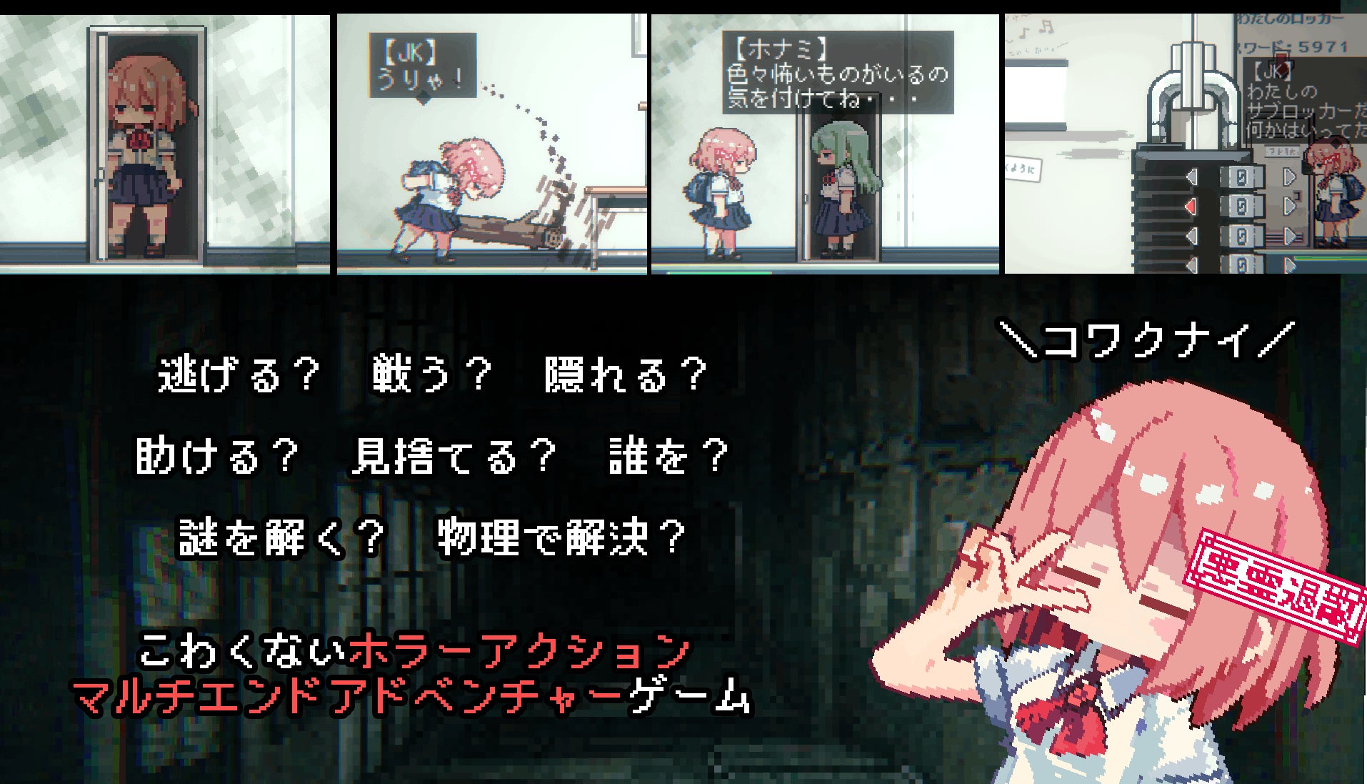 夜の学校を探索し、ロッカーを調べたりクラスメイトと交流し、脱出を目指します。