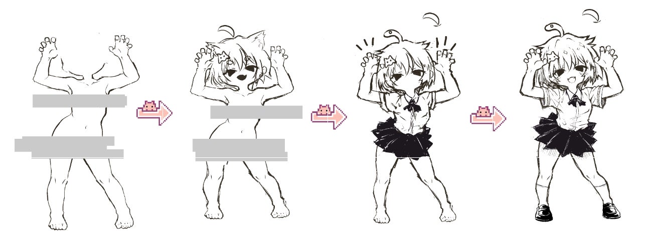私は一度体を描いてから服を描くといった感じの工程を取る事が多いのですが、