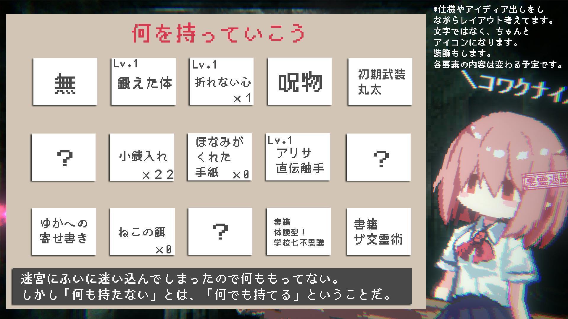 あるアイテムを持っているとステータスが上がったり、イベントの展開が変わったりなどする予定です。