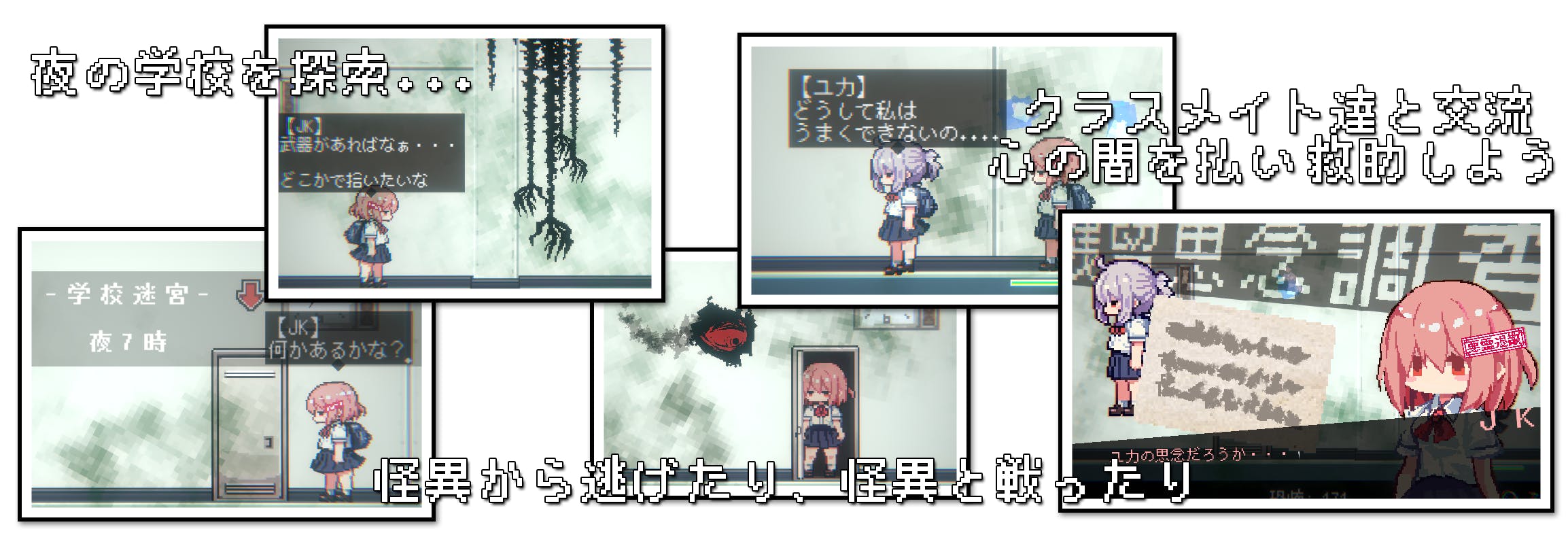 夜の学校を探索し、ロッカーを調べたりクラスメイトと交流し、脱出を目指します。