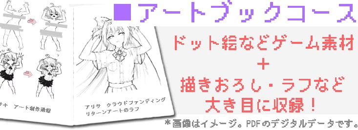 ゲーム素材を中心に、Xなどで公開していたイラストなどを見やすいようにまとめたデジタルアートブック(PDFを予定)をお送りします。