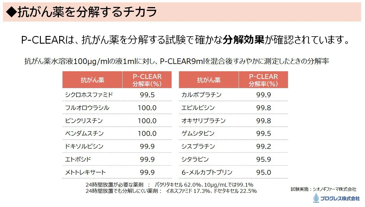 P‑CLEARは、独自のテクノロジーにより、抗がん剤の成分を分解することを目指して開発されました。国内の検査機関でのエビデンス取得も進み、その効果は科学的にも裏付けられつつあります。
