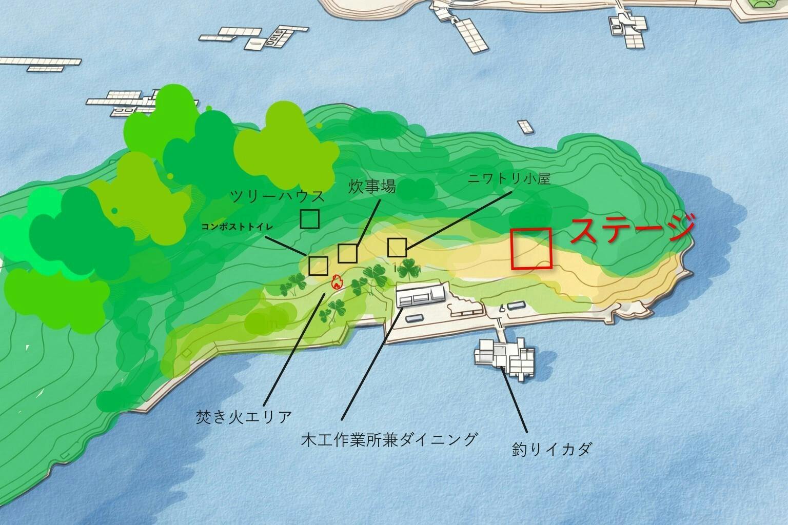 (屋外)イカダの上のキャンプ場/コンポストトイレ(男女別)/シャワー/かまど/炊事場/テラス/桟橋/ファイヤーサークル/鶏小屋/畑/果樹園