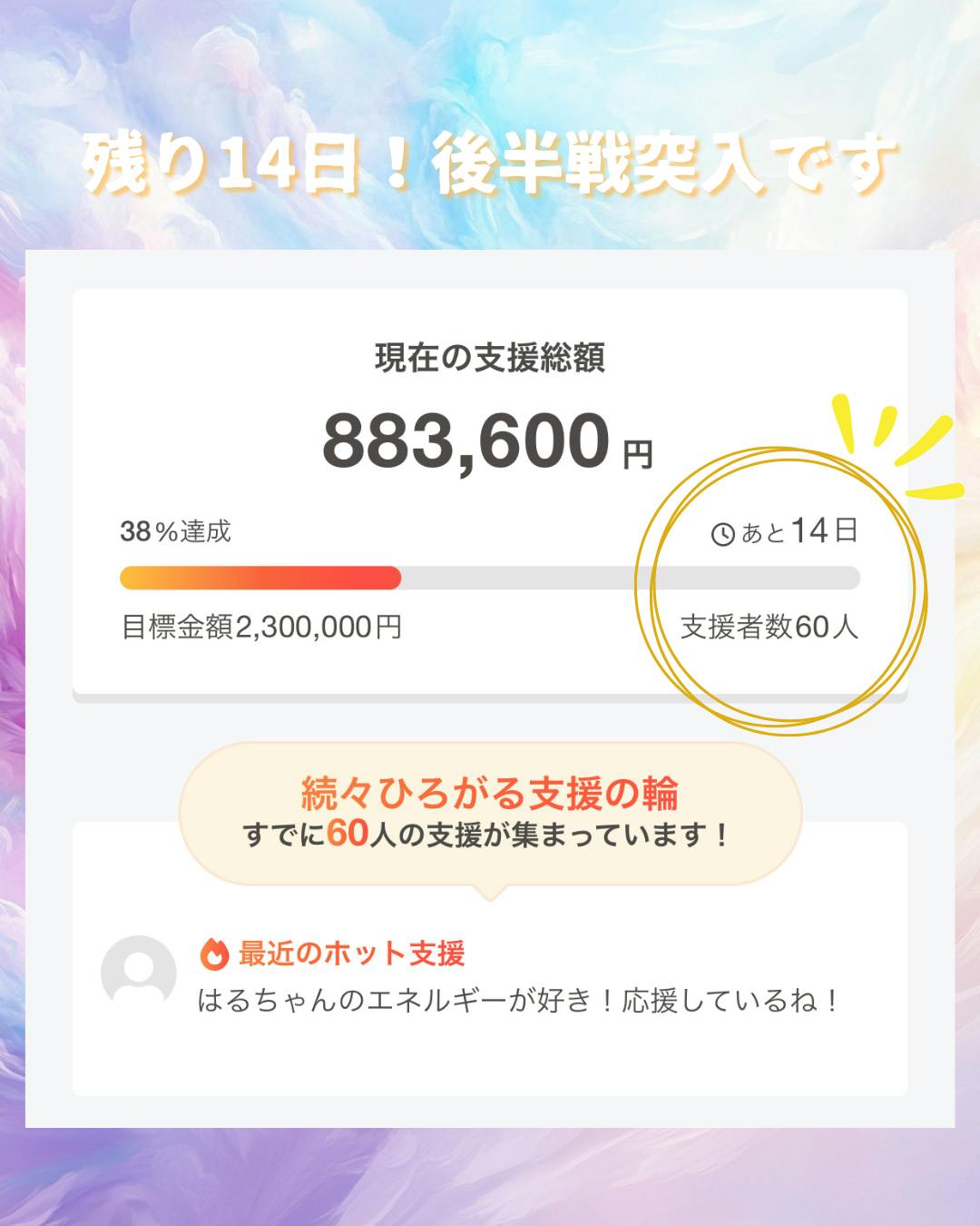 ここまでに 60名の方 から応援をいただき、心から感謝の気持ちでいっぱいです。
