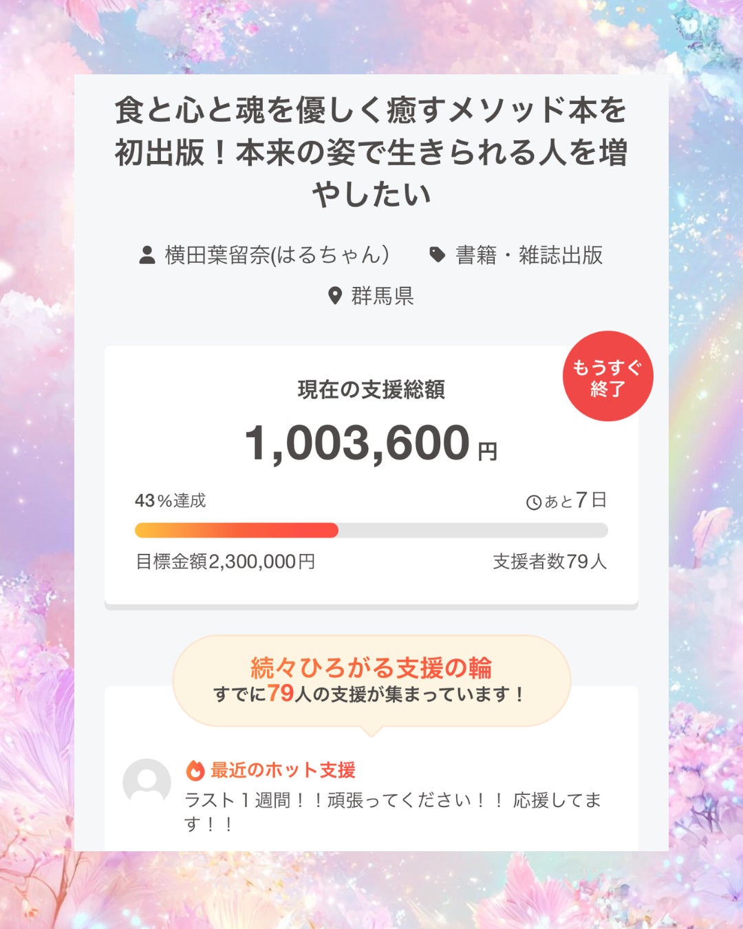 【クラファン残り4日!】応援してくださっている皆さん、本当にありがとうございます。おかげさまで 51%達成!93名の方 に応援していただきました。この1ヶ月間、日々の応援やあたたかいメッセージに何度も励まされ、ここまで走り続けてこれました。執筆も進み、完成に向けて形が見えてきています。本の中では、私自身が「心と体と魂を癒すために大切にしてきたこと」そして「食を通して自分を愛するということ」を丁寧に綴っています。この本を必要としてくれる誰かの手に、確実に届けたい。たくさんの人を癒し、その人の光を思い出す本になりたい!その想いで、最後の4日間も全力で進みます。どうか、あなたの力を貸してください。一緒に“食と心と魂の癒し”を広げていけたらうれしいです。食べることは生きる上で必要なことだから私は食を通じて、癒しを伝えたい。楽に本来の自然な姿で、健康に生きる人を増やしたいです。最後はみんなで笑って終われますように。引き続き応援よろしくお願いします。