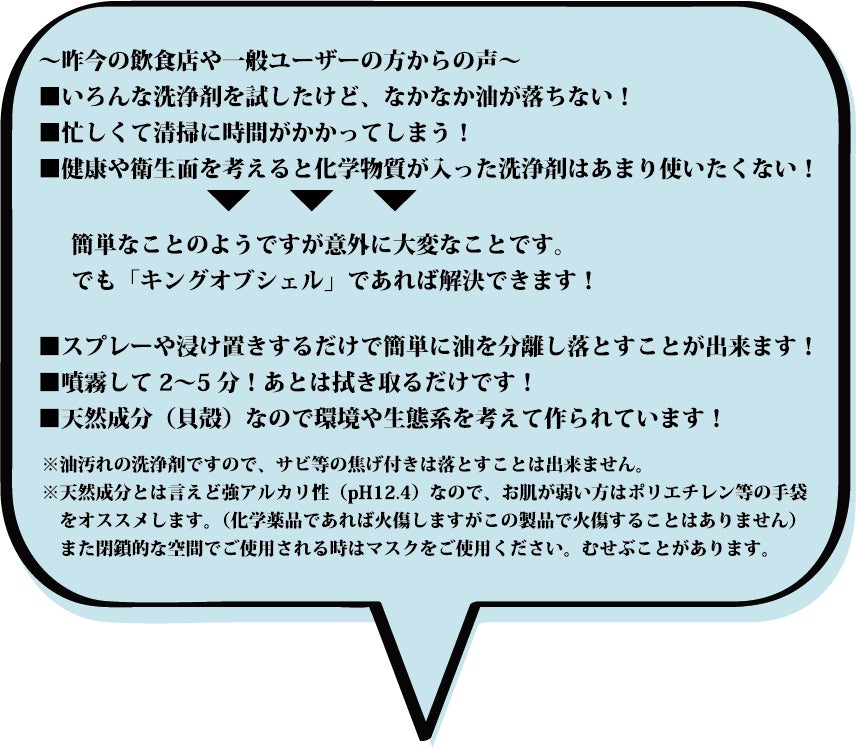 元々この「キング・オブ・シェル」は業務用として作られており、厨房の油汚れ、グリースなどを使う工場の油汚れに使用する目的として開発されました。
