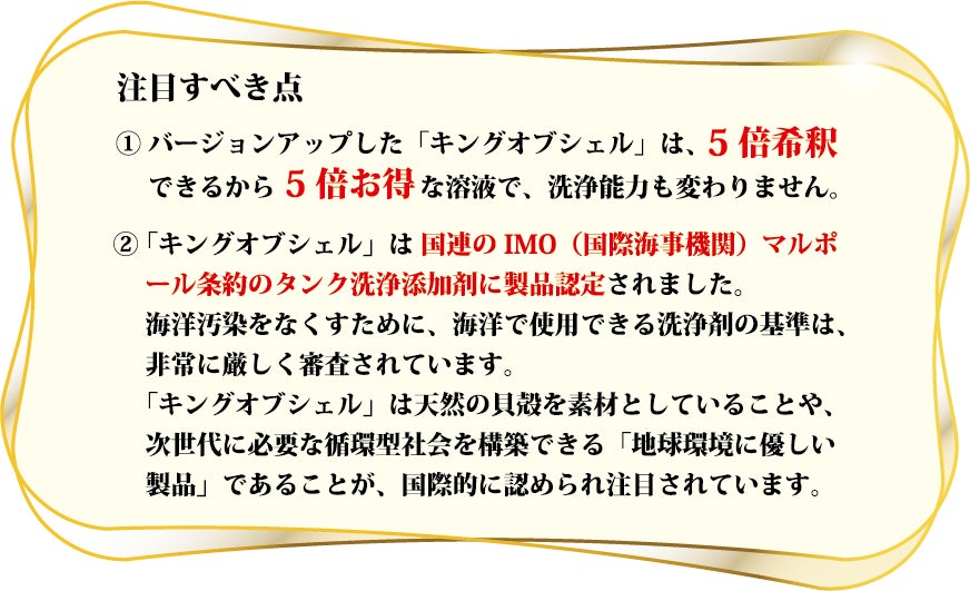 3.「キングオブシェル」は、国連のIMO(国際海事機関)マルポール条約のタンク洗浄添加剤に製品認定された環境や生態系に優しい洗浄剤です。