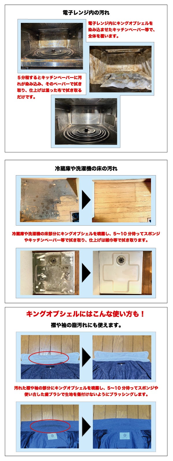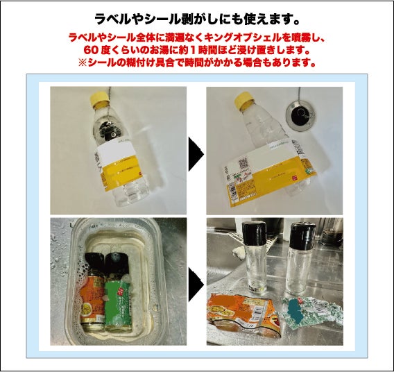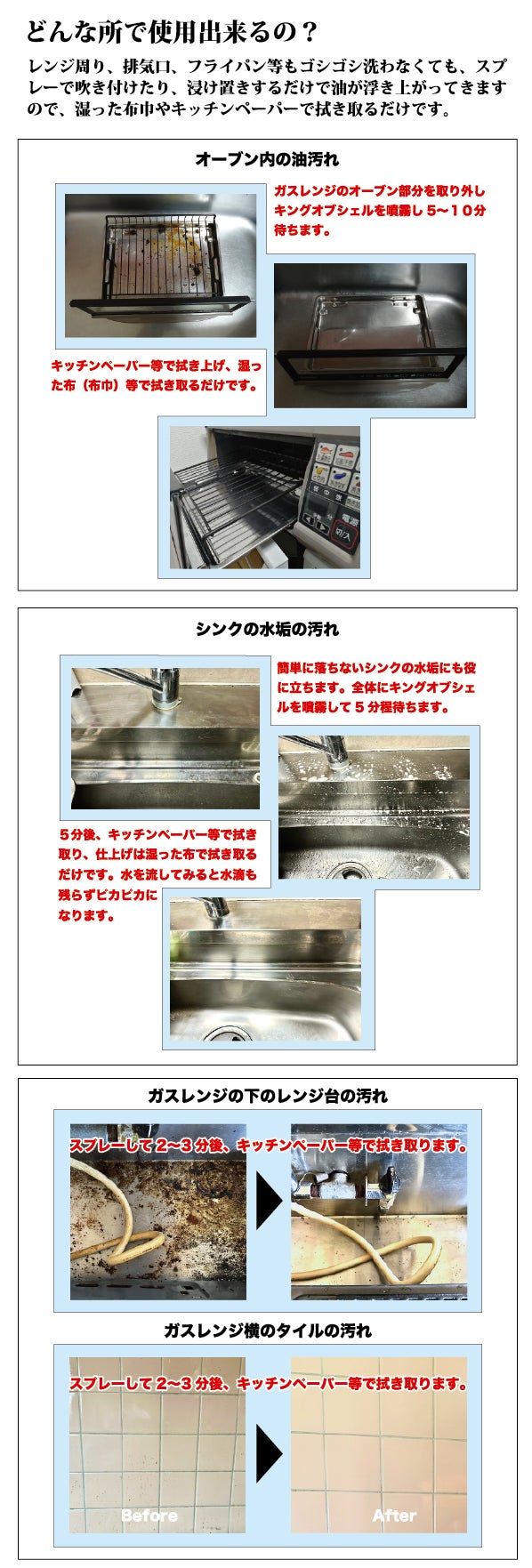 キングオブシェルの使用用途は、飲食店等の厨房や台所の換気扇やシンク廻りの油汚れ、電子レンジやオーブン、ガスレンジ等の油汚れ、シンクの水垢の汚れ、電化製品の表面の汚れ、ガラス窓や食器の汚れ、フローリングの汚れの他、Yシャツの袖や襟の脂汚れ、レースカーテン等のヤニの汚れなど多岐に渡ります。