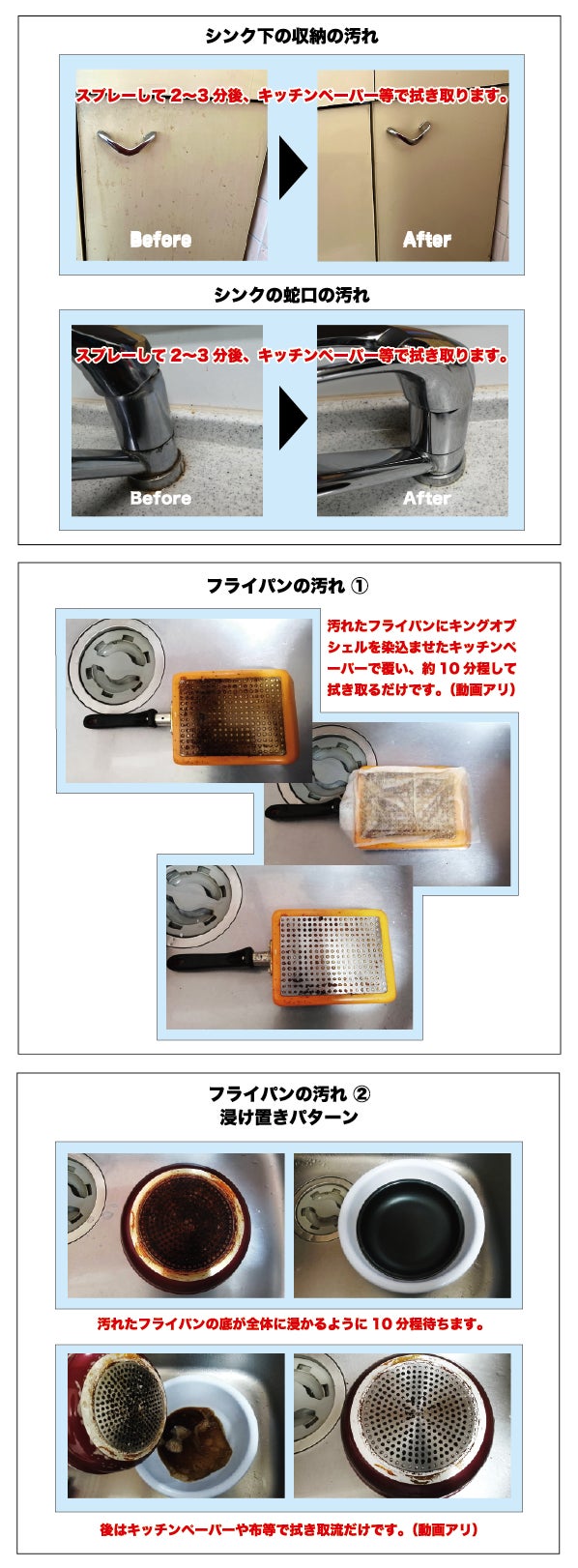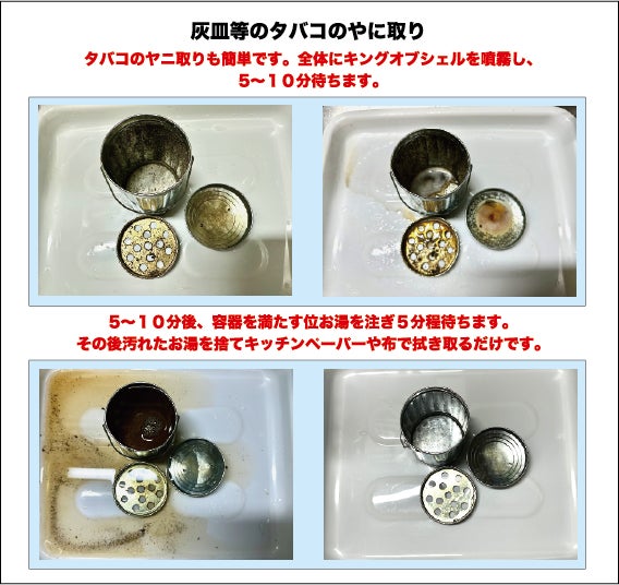 ※ 但しフライパン等に黒く焦げ付いた部分は、その度合いによって取り辛い事があります。これは油ではなく焦げつきやサビですので、場合によっては10~20分ほど浸け置きにし、少し目の荒いスポンジタワシ等をご使用してみてください。 キングオブシェルは油汚れを落とすクリーナーでサビ落としではないことを予めご了承ください。