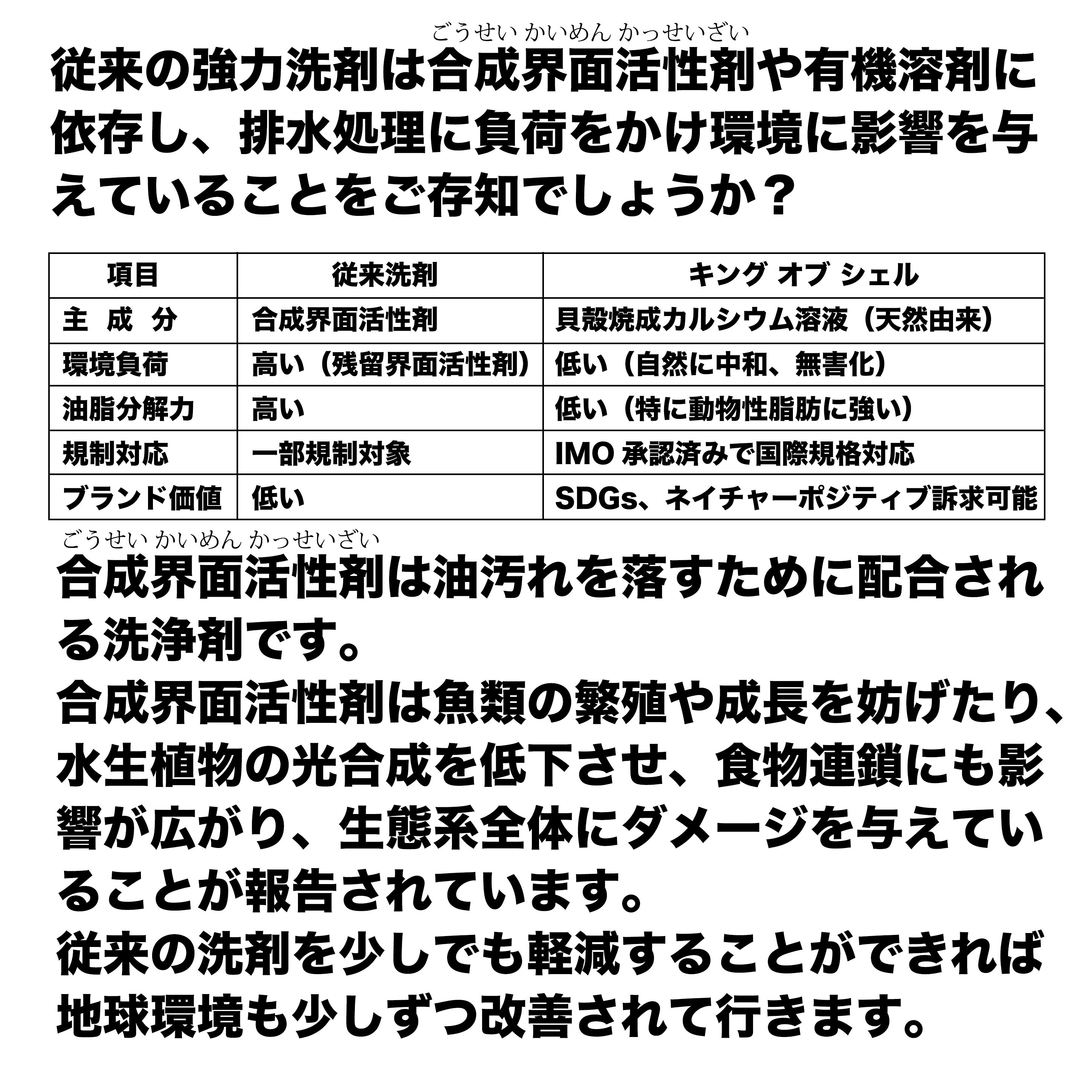 海洋汚染防止のために、航海上で使用出来る洗浄剤の基準は厳しく審査されており、その基準に合格した「キングオブシェル」は廃棄された貝殻を再利用しており、サスティナブルなこれからの時代を見据えた製品として、国際的に注目されています。