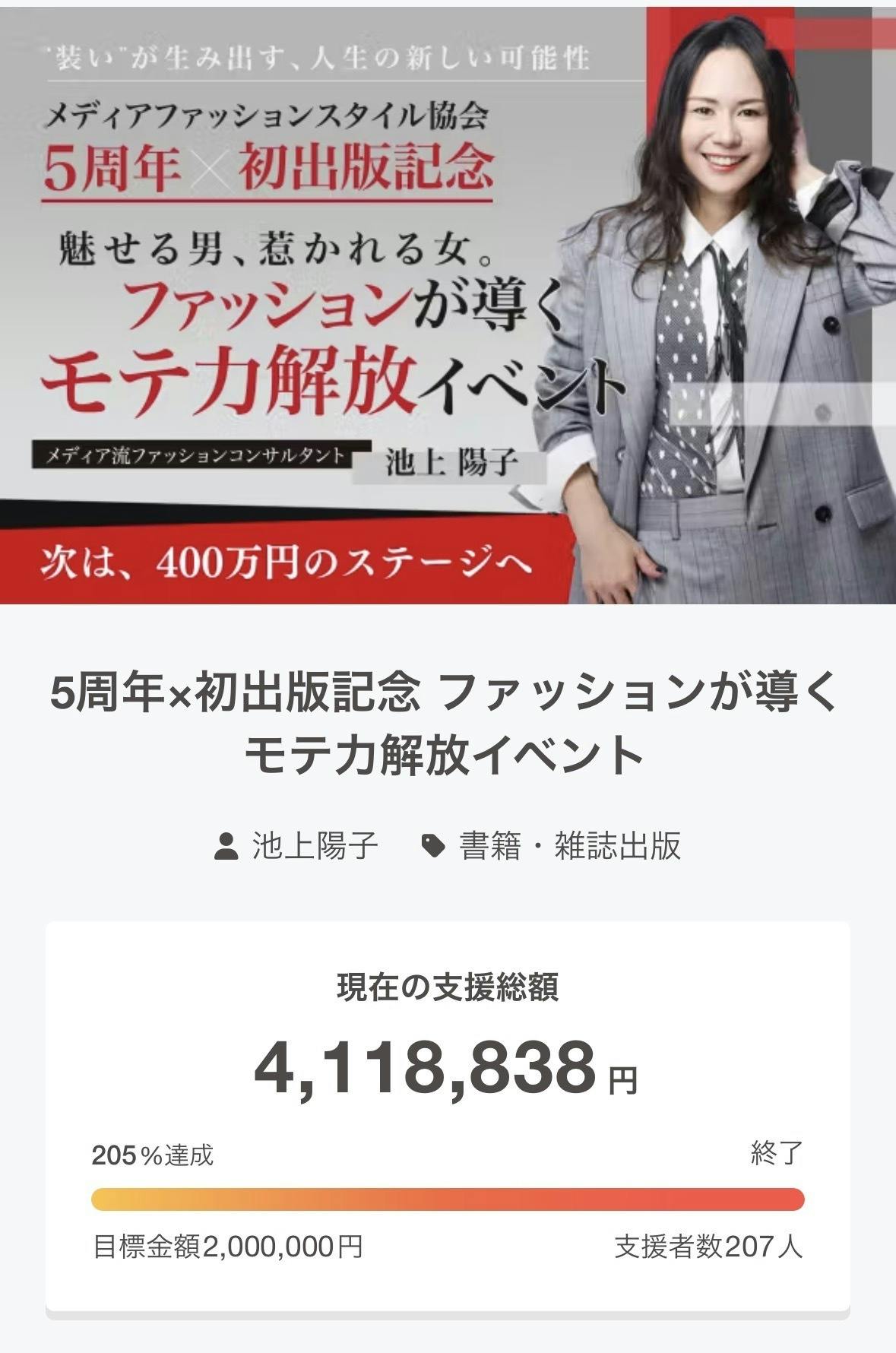 2026/03/01 16:50こんにちは、池上陽子です。昨日、クラウドファンディングが無事終了しました。結果は…支援人数 207名ネクストゴール 400万円達成本当に、本当にありがとうございます。正直に言うとここまで来られるとは思っていませんでした。クラファンはただ資金を集めるものではなくて、「誰が応援してくれているのか」「この挑戦は必要とされているのか」それがすごく見える時間でした。ページを作り、メルマガを書き、何度も発信して。不安もありました。でもそのたびに支援が増えていく通知を見るたびに「応援してるよ」「楽しみにしてる」そんな声をたくさん感じることができました。この207名の応援は私にとって、数字以上のものです。このプロジェクトはここで終わりではありません。3/19のイベントでその想いを、形にします。ファッションショーブランドポップアップ撮影会トークショー来てくださる方が「来てよかった」と思える一日にします。そしてもうひとつ。今回のクラファンを通して改めて思いました。ファッションには人を前に進ませる力がある。だからこれからもこの挑戦は続けます。応援してくださった皆さん、本当にありがとうございました。またご報告させてください。池上陽子 もっと見る