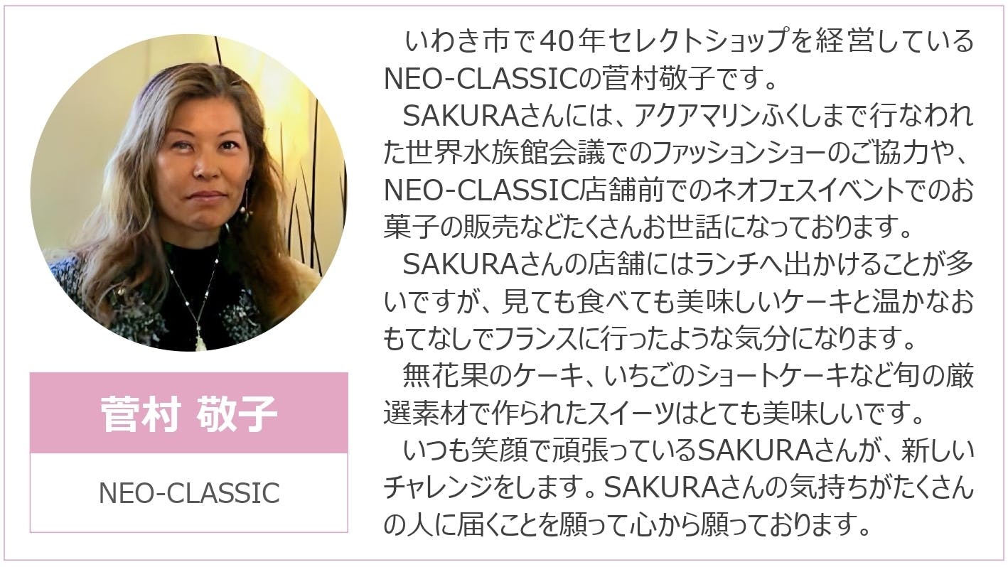 このプロジェクトをご覧いただきまして、ありがとうございます。福島県いわき市で洋菓子店「SAKURA」を営んでおります「有限会社サクラクリエーション」の齋藤京子と申します。1982年の創業以来、「農は大本なり」「食は体を作る」「子どもたちに安心な食を」のコンセプトのもと、40年以上にわたり地域でお菓子づくりを続けてきました。無添加・厳選素材にこだわり、生産者の方々との深いつながりを大切にしてまいりましたが、契約農家さんの高齢化による引退をきっかけに、2022年頃から自ら農業にも挑戦し、イチジクや赤じそを活かした循環型の商品づくりを始めています。