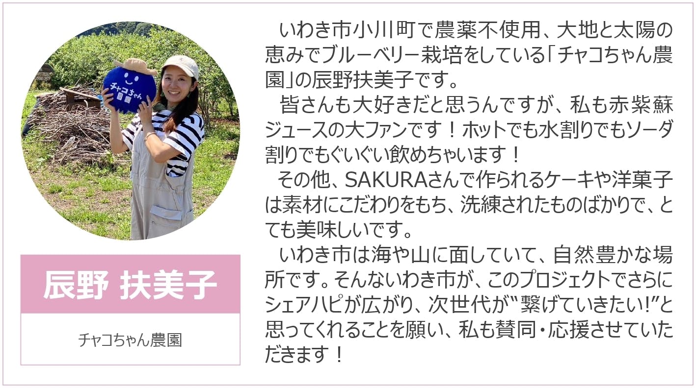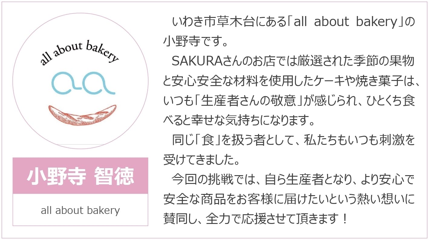 このプロジェクトをご覧いただきまして、ありがとうございます。福島県いわき市で洋菓子店「SAKURA」を営んでおります「有限会社サクラクリエーション」の齋藤京子と申します。1982年の創業以来、「農は大本なり」「食は体を作る」「子どもたちに安心な食を」のコンセプトのもと、40年以上にわたり地域でお菓子づくりを続けてきました。無添加・厳選素材にこだわり、生産者の方々との深いつながりを大切にしてまいりましたが、契約農家さんの高齢化による引退をきっかけに、2022年頃から自ら農業にも挑戦し、イチジクや赤じそを活かした循環型の商品づくりを始めています。