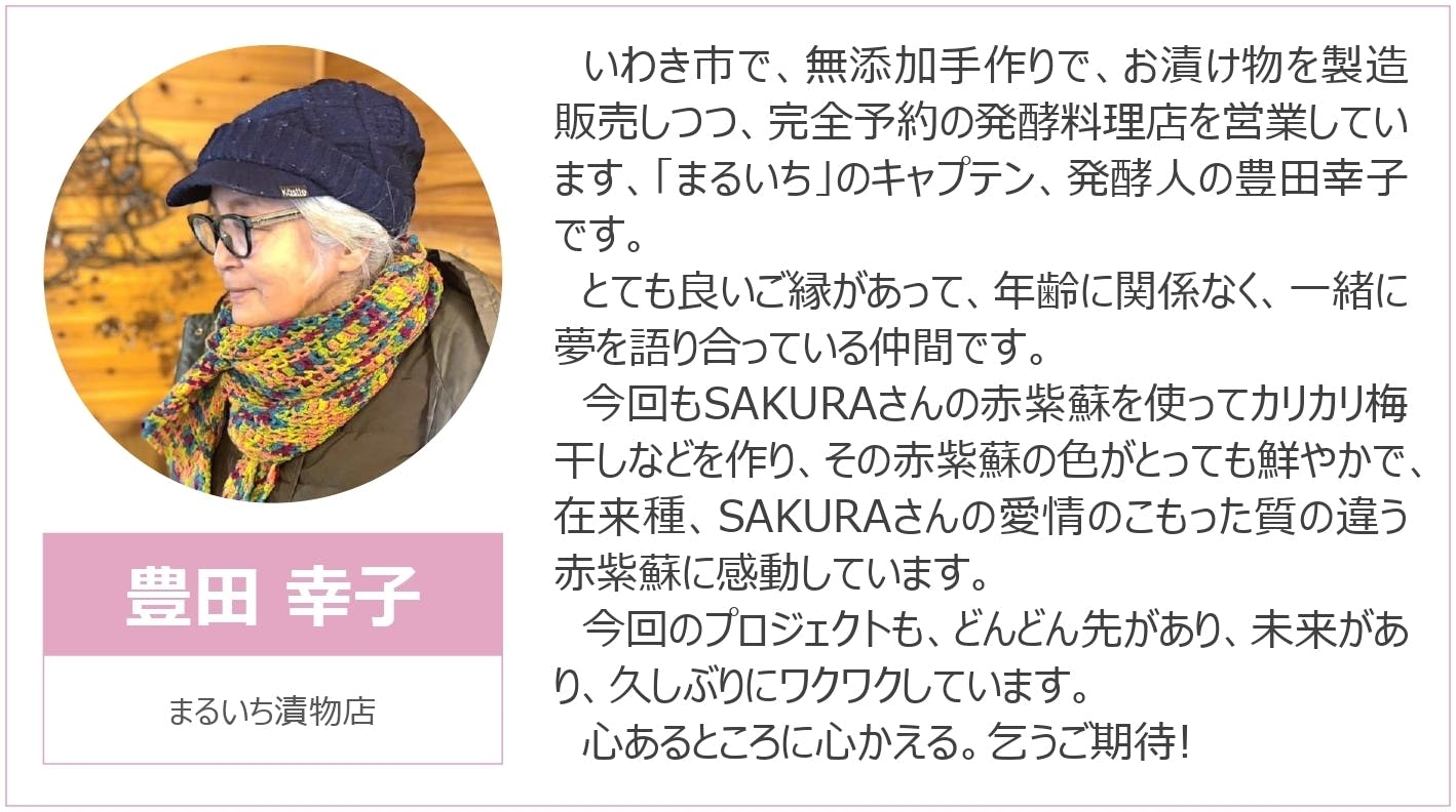 赤じそは、偶然の出会いから始まったものですが、今では地域と未来をつなぐ大切な存在です。日本のハーブとも言われるくらい栄養も文化もある赤じそで、食べる人の体も心も元気にし、地域の農業と文化を守る一歩につなげたいと考えています。