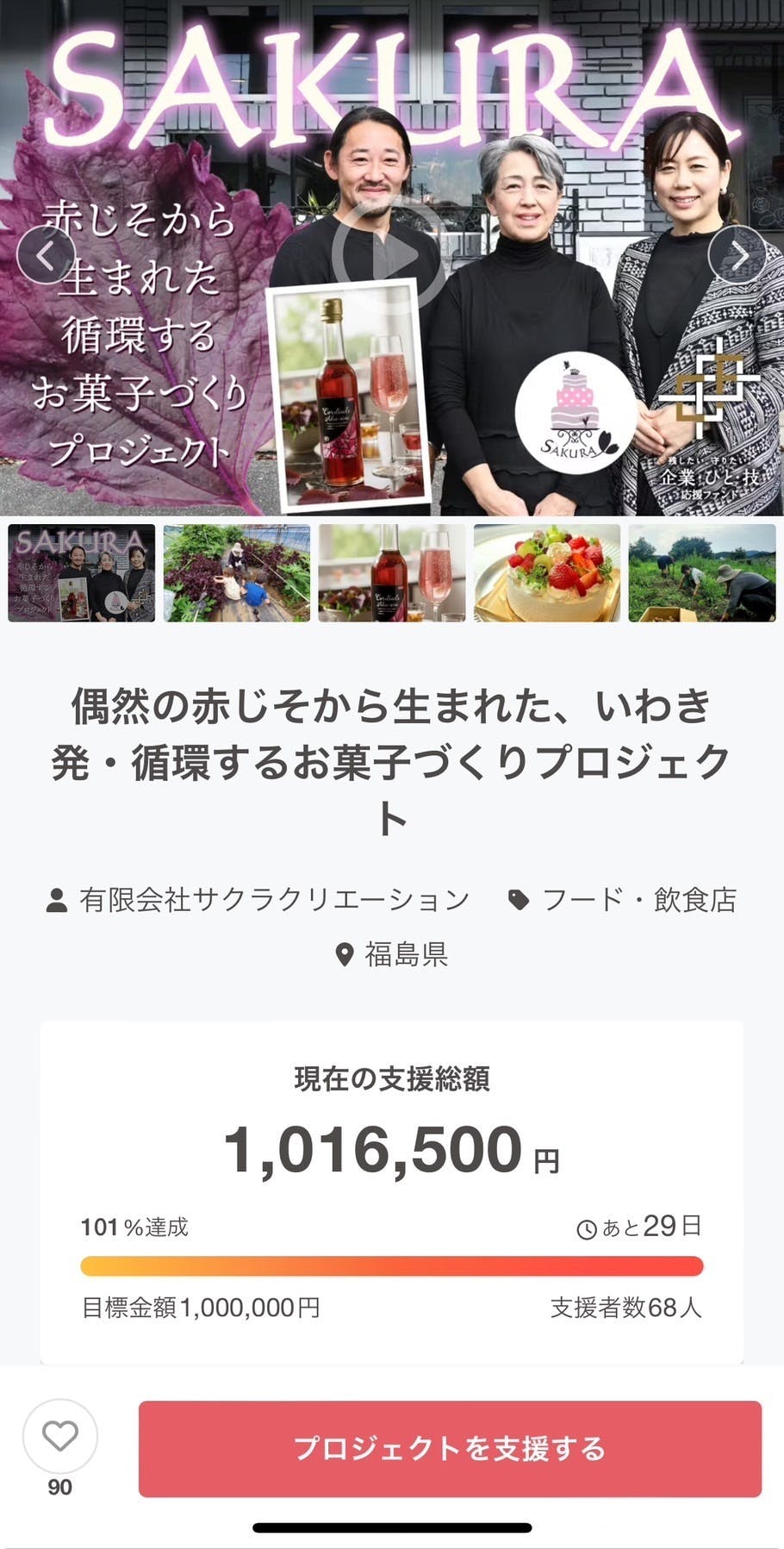 2026/02/14 16:03【ご報告】こんにちは福島県いわき市にございます厳選素材の洋菓子店SAKURAです!クラウドファンディング開始からわずか15日、皆様からのご支援総額が100%に到達しました!!沢山のご支援をいただき心から感謝申し上げます。クラウドファンディングに挑戦することを決めてからは私たちの挑戦をより多くの皆さまに知っていただくためさまざまな準備をしたり、遠野和紙様やまるいち様をはじめたくさんの方々からご協力や心強い応援のメッセージをたくさんいただきました。目標に向け準備作業をしていく中で不安に思うこともありました。しかし、私たちの取り組みが私たちだけでなく目の前のお客様、地域、次の世代の子供たち、地球環境などさまざまな明るい未来へ繋がることと信じ活動を続けてまいりました。その一つの結果として、今回のクラウドファンディングで目標を達成できましたことは皆さまおひとりおひとりからのご協力・応援があったからだと実感しております。心から感謝申し上げます。SAKRAでは皆さまからの応援を元にさらに活動を広めていけるようクラウドファンディング締め切りの3月15日まで引き続き皆さまからの応援・ご協力をお願いいたします。 もっと見る
